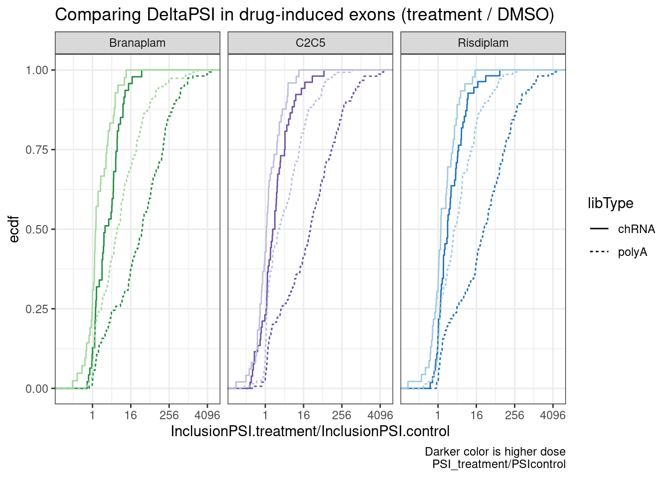 labs(y="ecdf", x="IntronExcisionRatio", caption=str_wrap("Comparing introns hosting the drug-induced cassette exons to all introns within the same set of genes", 50))