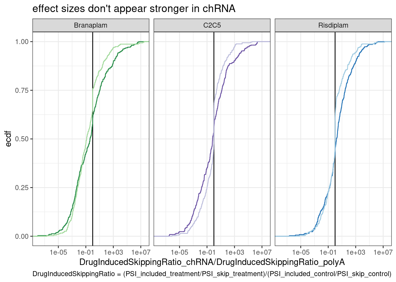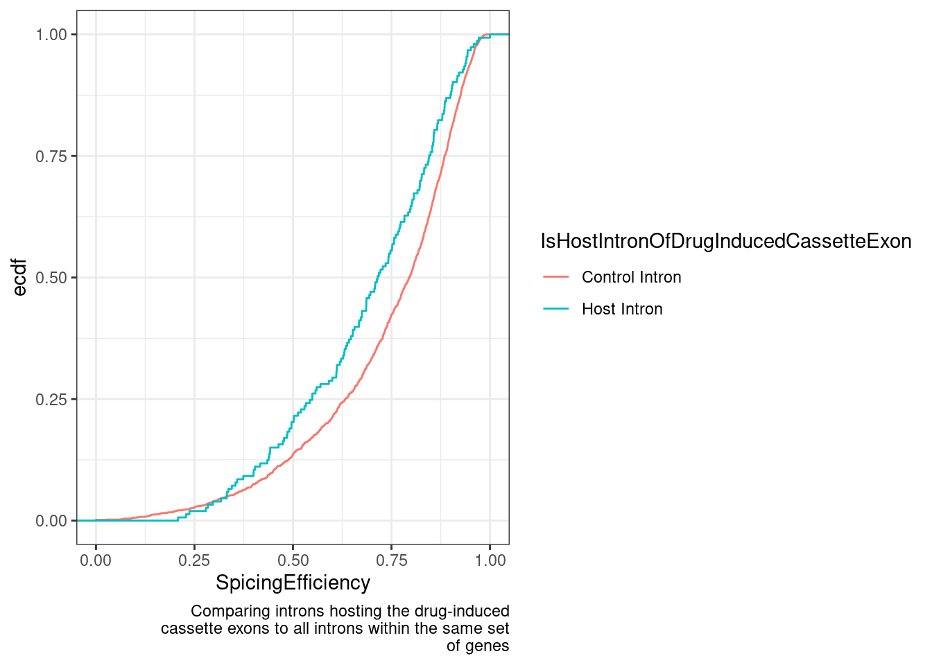 labs(y="ecdf", x="SpicingEfficiency", caption=str_wrap("Comparing introns hosting the drug-induced cassette exons to all introns within the same set of genes", 50))