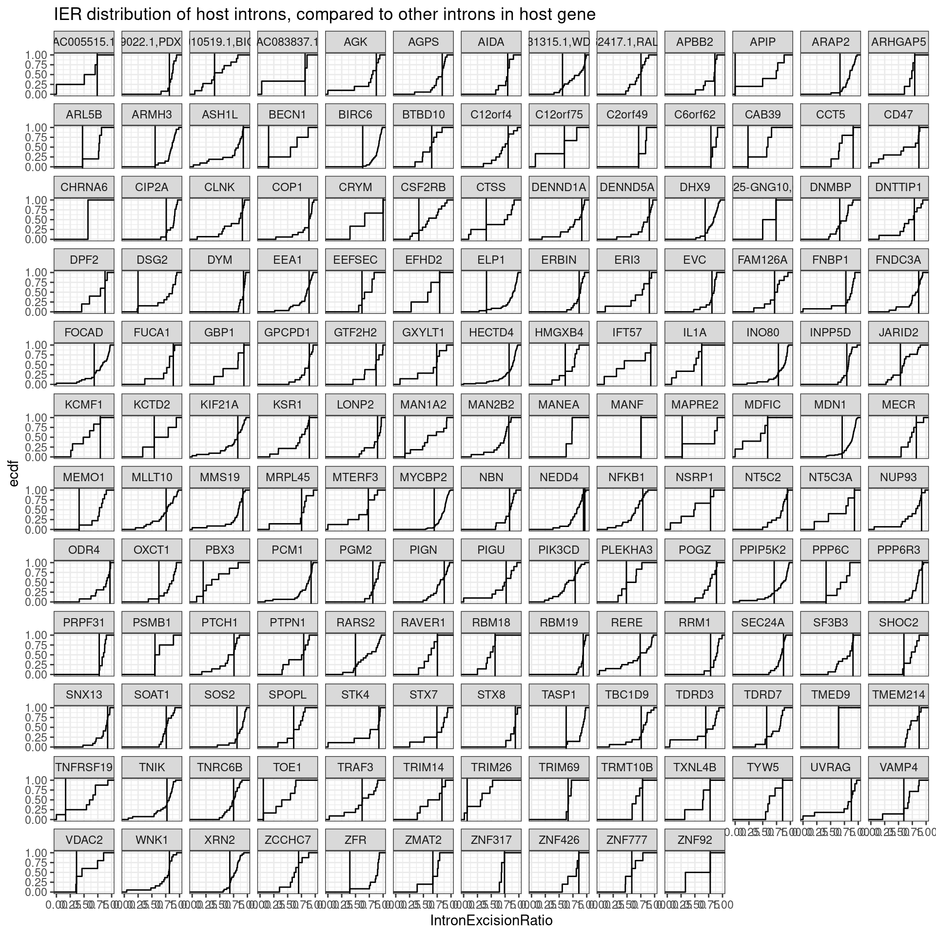 labs(y="ecdf", x="IntronExcisionRatio", title="IER distribution of host introns, compared to other introns in host gene")