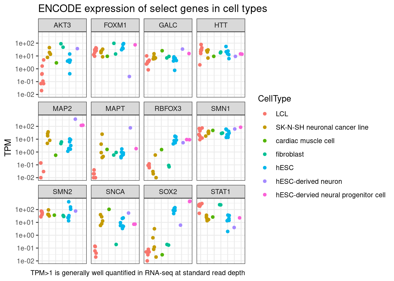 labs(title = "ENCODE expression of select genes in cell types", x="Cell type", caption="TPM>1 is generally well quantified in RNA-seq at standard read depth")