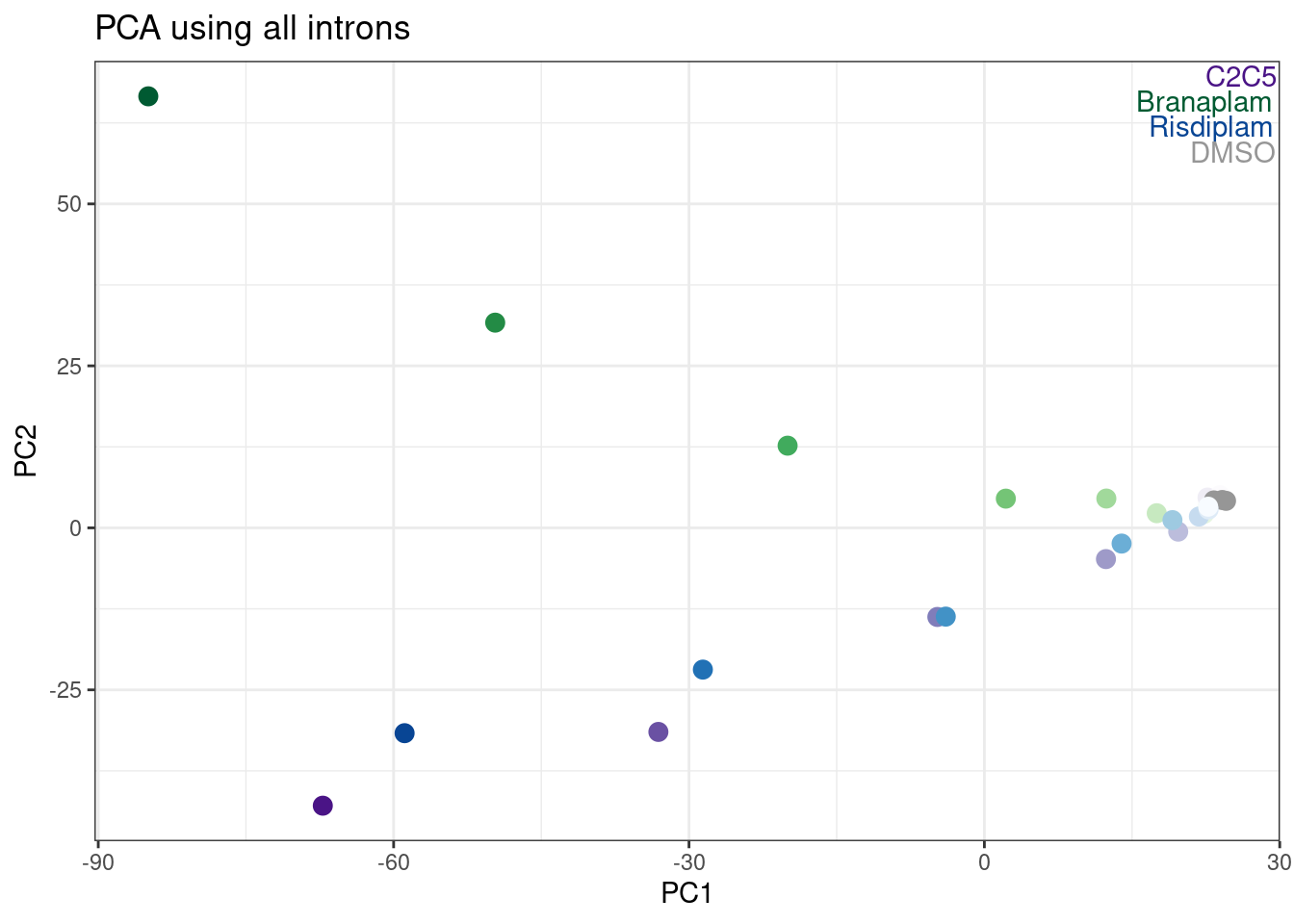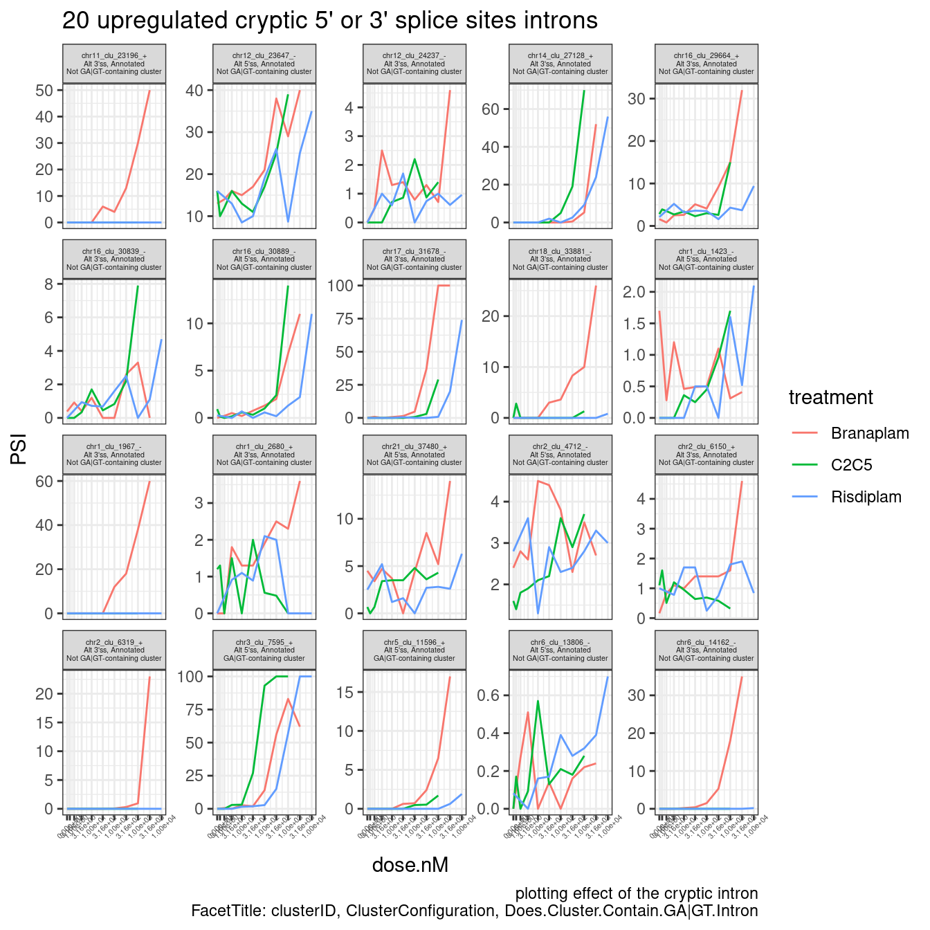 If I find a large fraction (say 50%) of reliable dose-response curves aren’t in a cluster containing a GA-GT intron, I will be a bit more intrigued by the hypothesis about U2 snRNA and branchpoints. However, since the BP can only be mapped in a basically invisible (to RNA-seq) and short-lived intermediate, it makes proving this hypothesis very difficult from current data. I feel like to really test this hypothesis, one would actually need to experimentally modify the BP region in a gene and test drug effects on splicing.