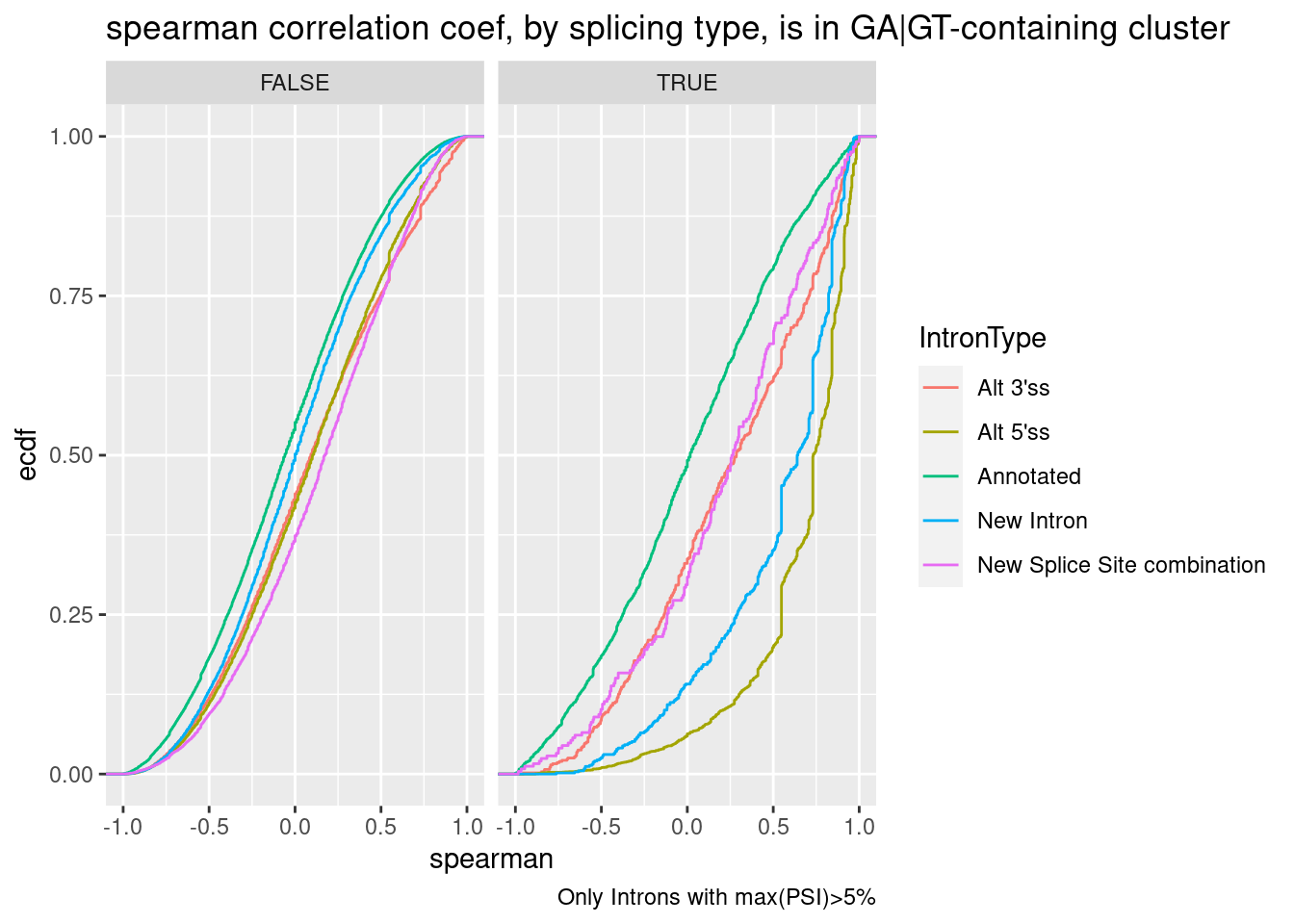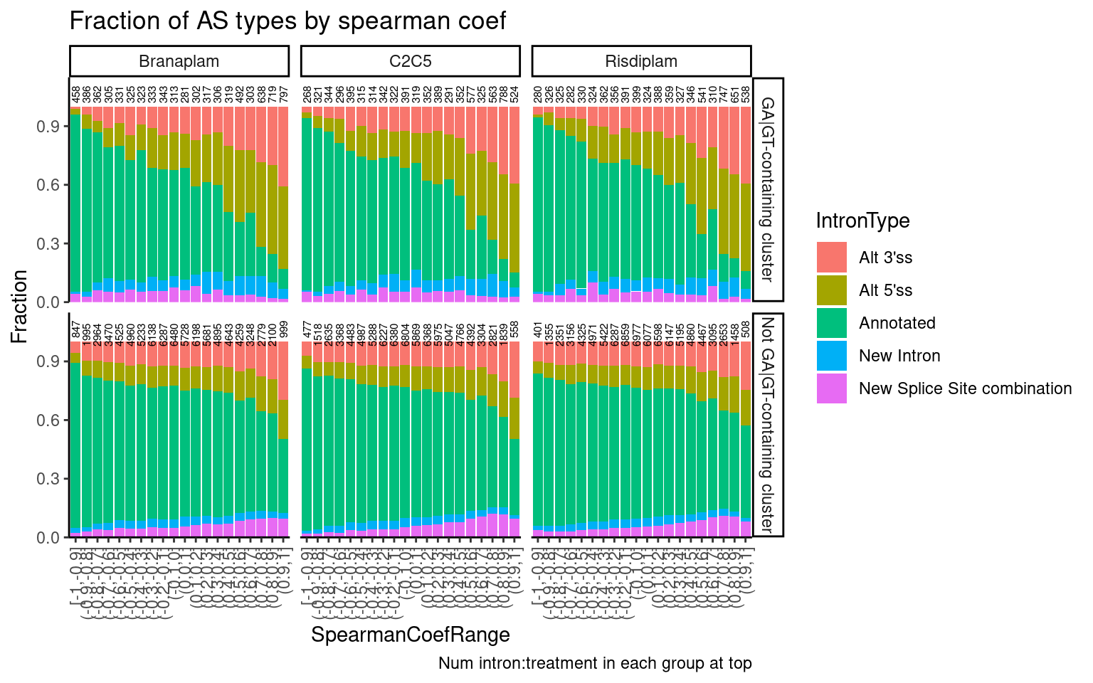 In my previous analysis based on fibroblast data, I found about as many instances of upregulated cryptic 3’ss splicing (restricted analyses to clusters with only 2 introns) as upregulated cryptic 5’ss. That suggested to me that the known mechanisms of increasing splicing at GA|GT introns only accounts for part of the observed splicing changes… For example, I hypothesized that these molecules may also promote activation of cryptic 3’ss through stabilizing non-canonical branchpoints with extra bulges to U2snRNA. However, I failed to detect any particular motif in the bpt region among the top cryptic 3’ss with MEME. Furthermore, in a more recent analysis, when I looked at the dose response data of a random set of ~200 introns, most introns did not have a reasonable looking dose-response effect, and in fact, the introns that did have a reasonable dose-response increase where mostly in GA-GT intron-containing clusters, suggesting the GA-GT introns do account for most of the direct dose-dependent effects of the molecules. Today I will investigate these ideas a bit more… For example, I want to get a better sense of what fraction of reliable dose-dependent effects can be attributed to GA-GT introns (or introns in the same cluster which can be attributed an effect on the GA-GT introns).