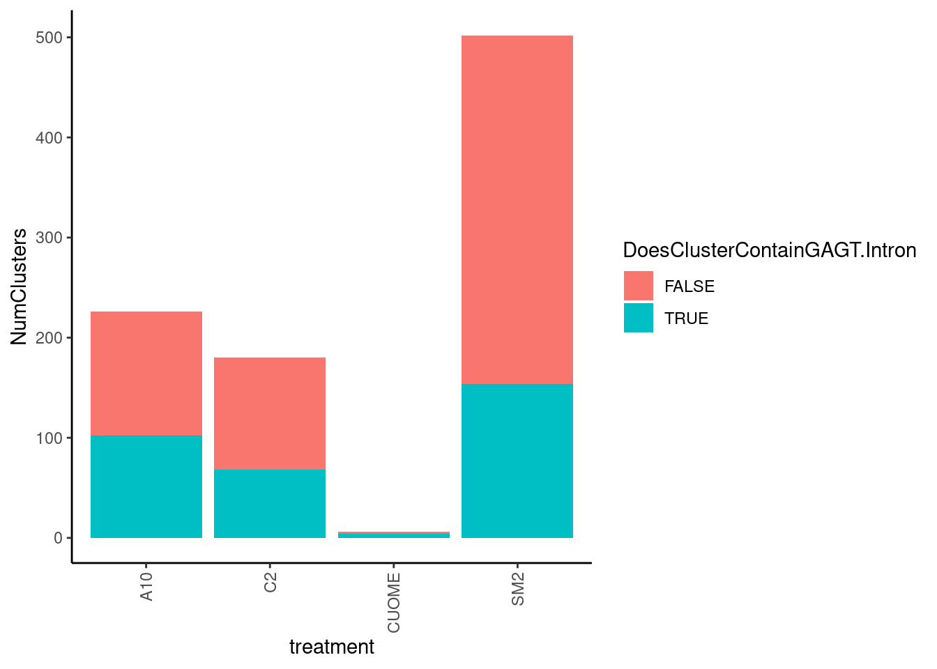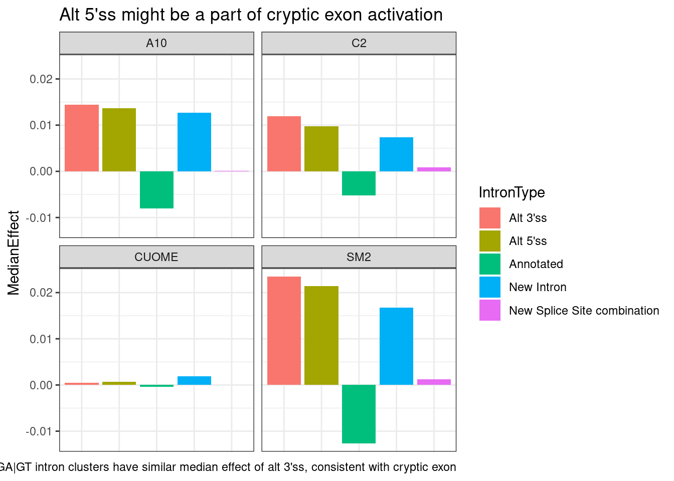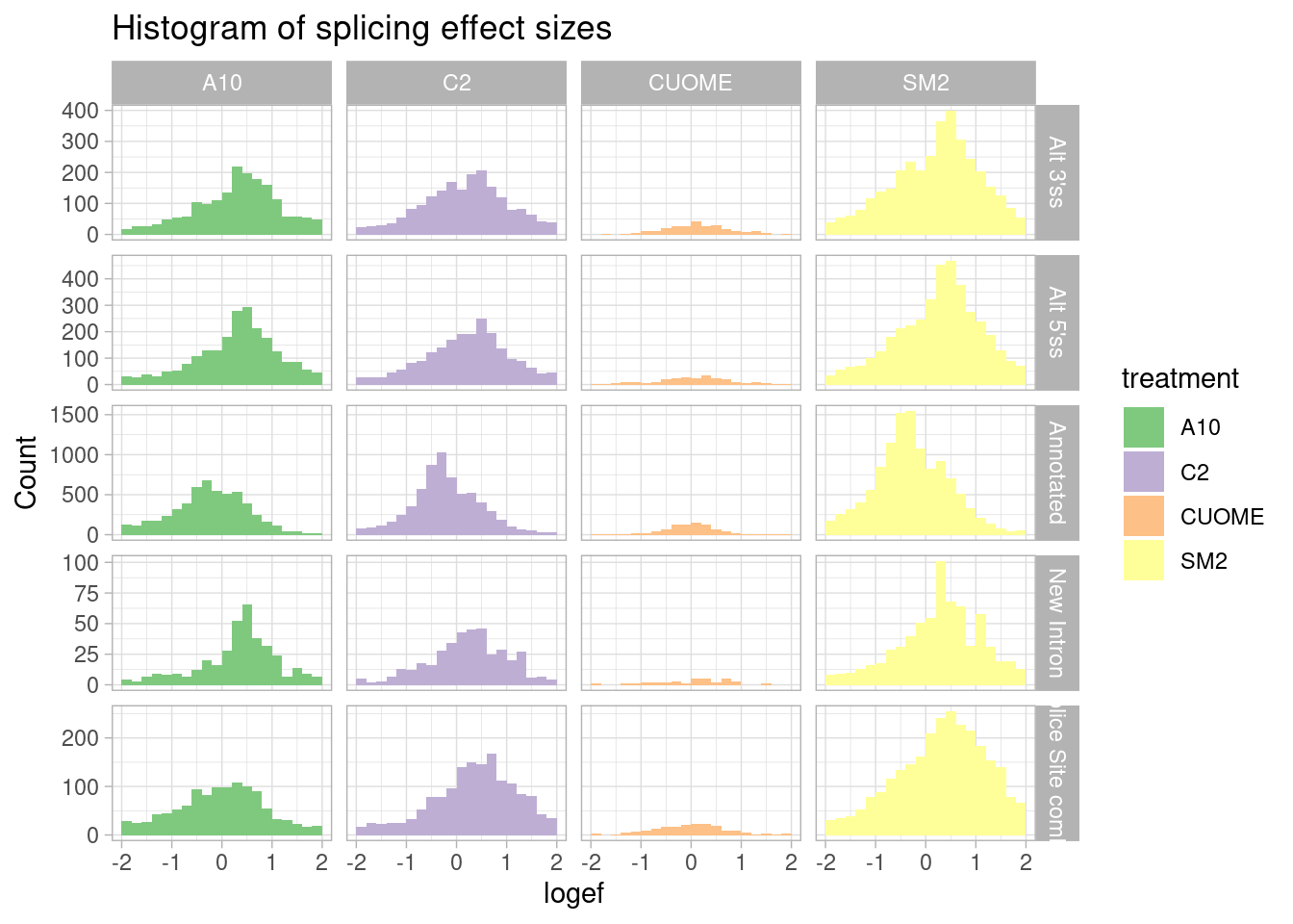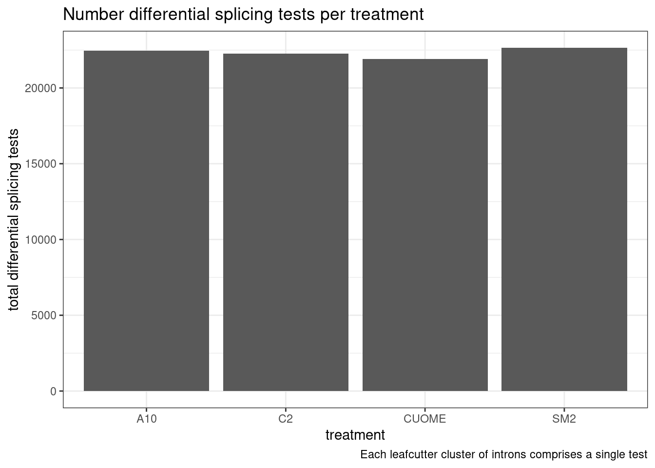 Our collaborator, Jingxin, is interested in how small molecular drugs might effect splicing as eventually be used as treatments, like risdiplasm to treat SMA. Although antisense oligos have also been used to treat causal splicing defects in some SMA forms, small molecules may have general advatage over antisense oligos in in terms of efficient delivery to the necessary tissues. His lab has treated cells with 4 small molecules (SM2, CUOME, A10, and C2) and a DMSO control, 3 replicates for each treatment and DMSO. The goal with this experiment is to explore the splicing effects of these small molecular drugs, trying to better understand their molecular effects. Splicing was measured by RNA-seq which I have aligned with STAR and measured splicing and differential splicing with leafcutter. I also performed differential expression testing, by counting reads, fitting expression models and testing for differences with DMSO using edgeR.