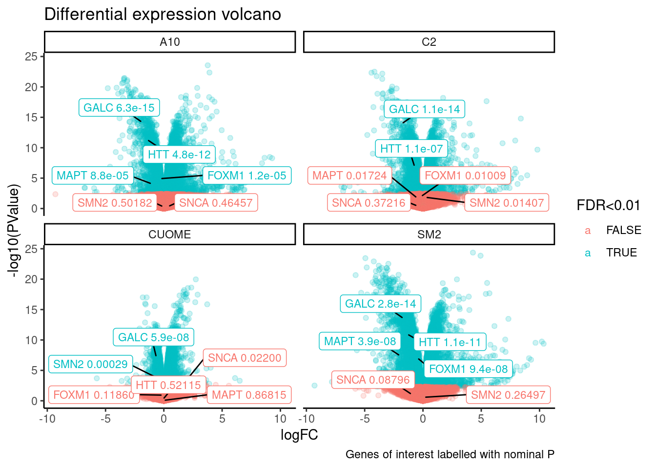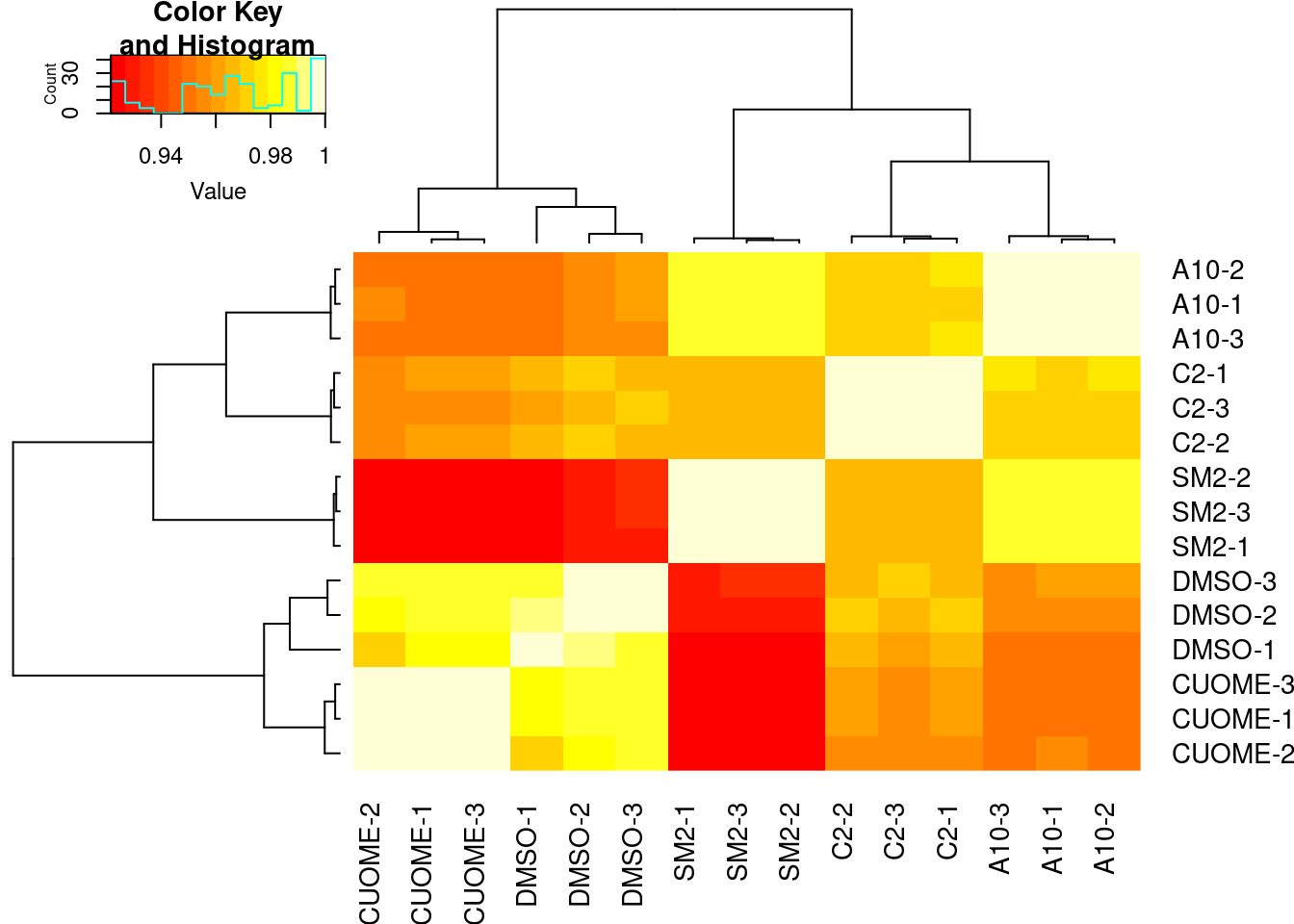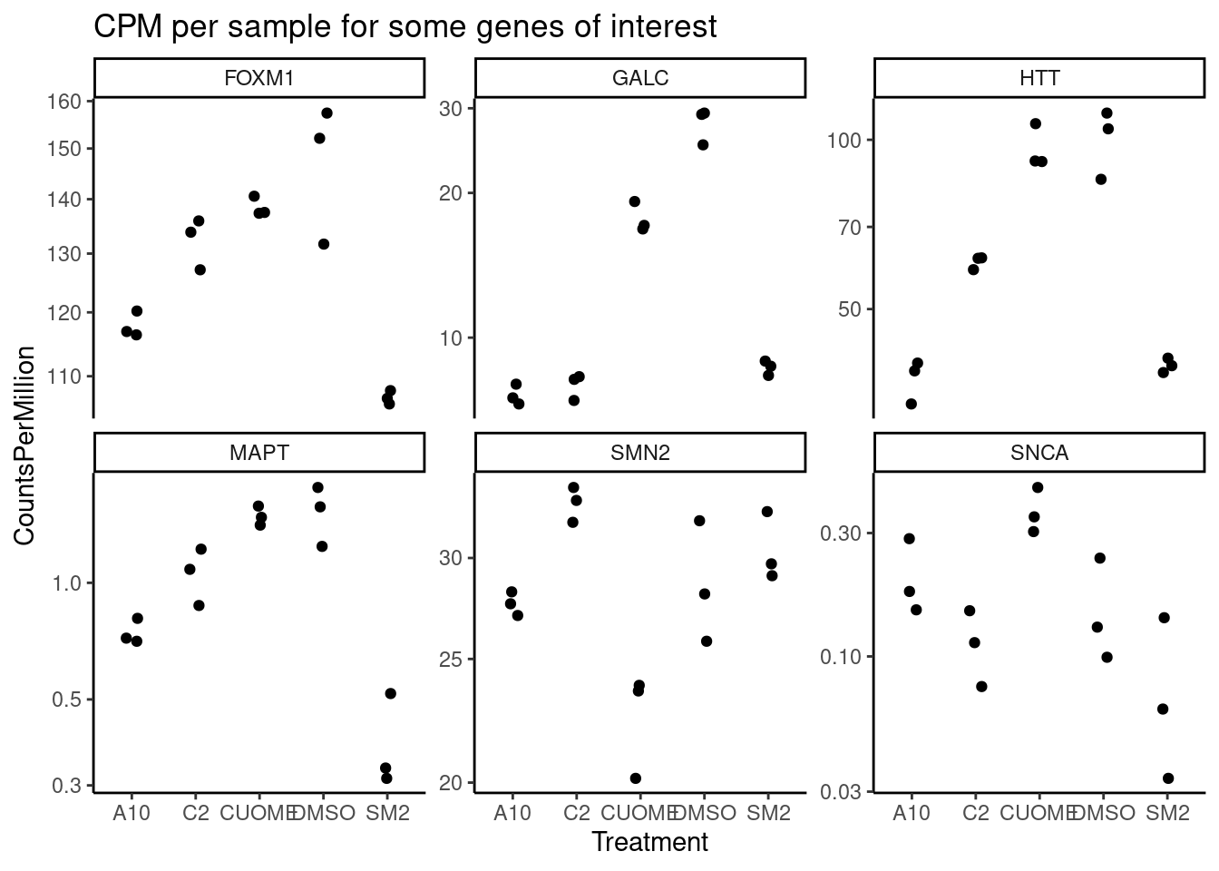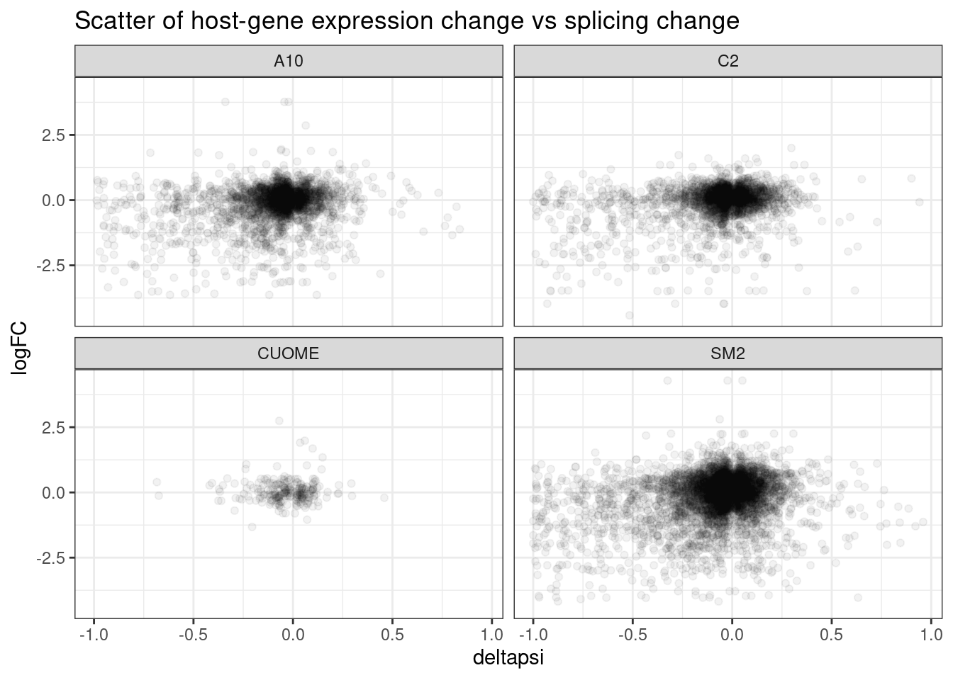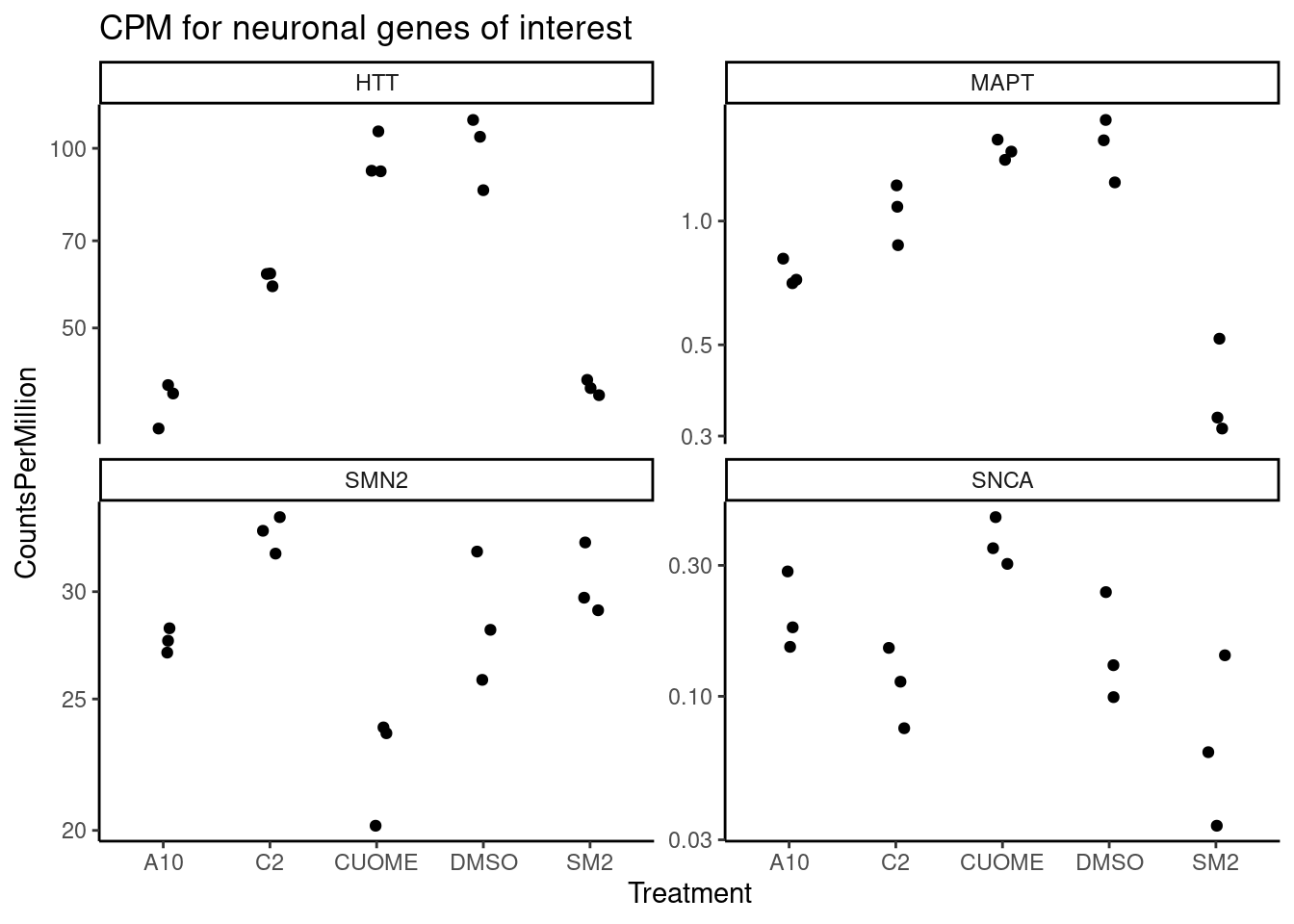 Our collaborator, Jingxin, is interested in how small molecular drugs might effect splicing as eventually be used as treatments, like risdiplasm to treat SMA. Although antisense oligos have also been used to treat causal splicing defects in some SMA forms, small molecules may have general advatage over antisense oligos in in terms of efficient delivery to the necessary tissues. His lab has treated cells with 4 small molecules (SM2, CUOME, A10, and C2) and a DMSO control, 3 replicates for each treatment and DMSO. The goal with this experiment is to explore the splicing effects of these small molecular drugs, trying to better understand their molecular effects. Splicing was measured by RNA-seq which I have aligned with STAR and measured splicing and differential splicing with leafcutter. I also performed differential expression testing, by counting reads, fitting expression models and testing for differences with DMSO using edgeR.