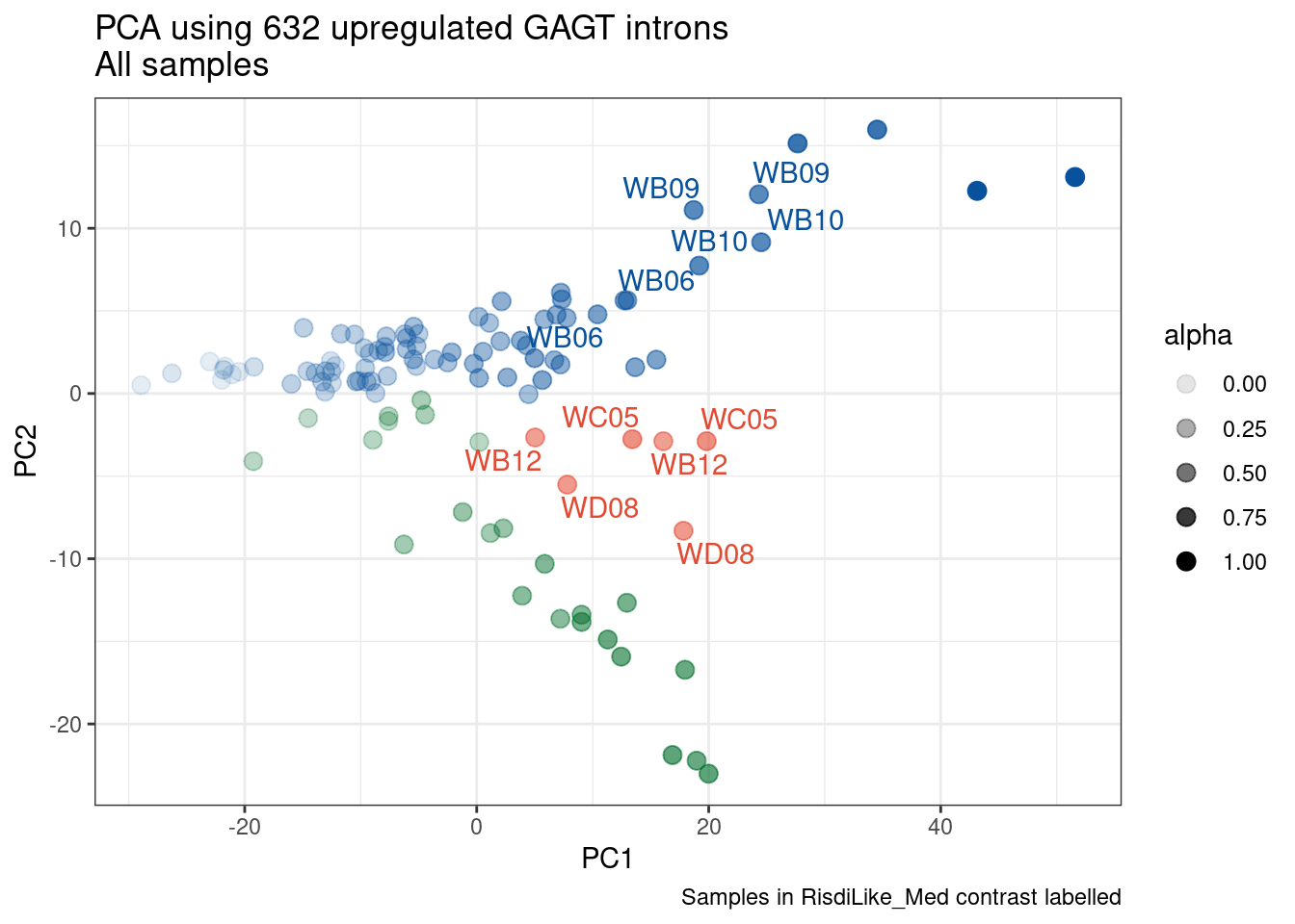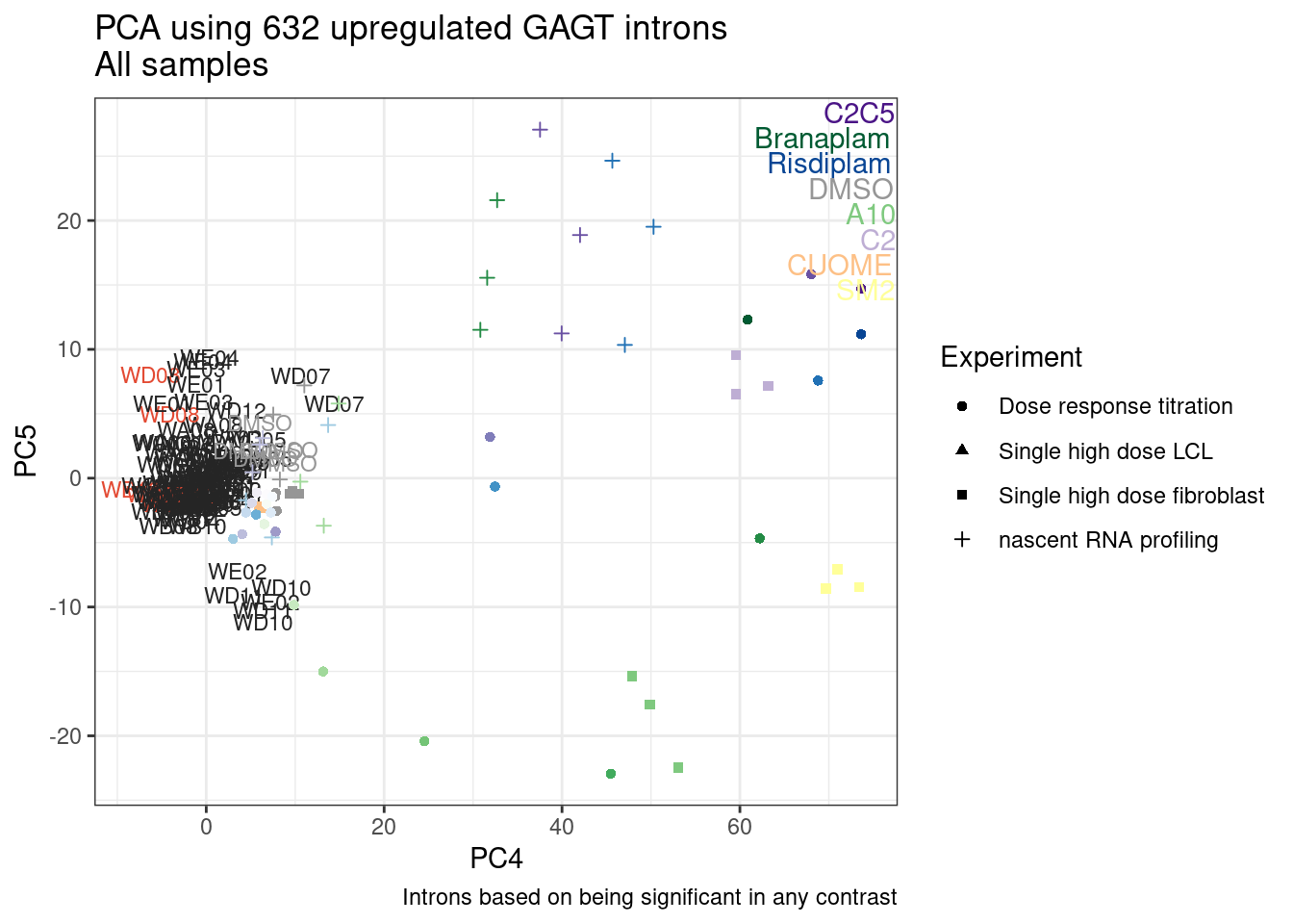 labs(title = "PCA using 632 upregulated GAGT introns\nAll samples", caption="Colored consistent in other plots")
