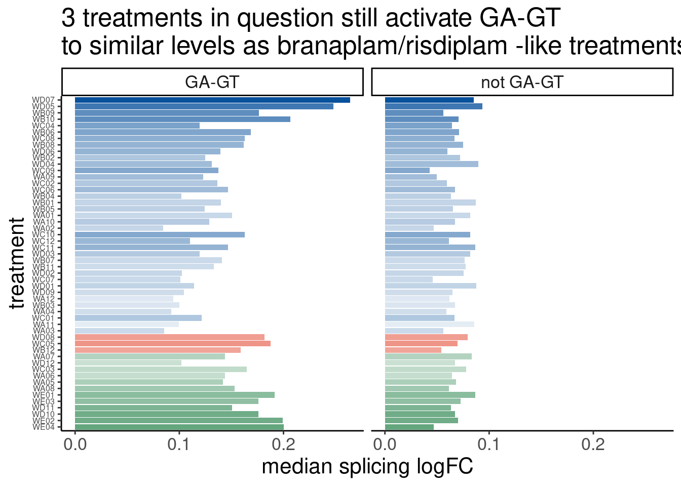 Also, looking at the genome browser of these two introns listed above it becomes obvious what the exon coordinates are if you were to design qPCR probes for validation… FHOD3 is particularly interesting… Much like I previously observed in HTT, the actual intron with the GA-GT 5’ss seems to be mostly retained in the treatment - it is the upstream cryptic intron that more obviously gets excised in the treatment. This suggests that the treatment may aid in U1 binding and activation of exon definition without necessarily activating the 5’ss bound to the molecule. This may also somewhat explain my previous observation that these molecules induce much cryptic 3’ss that aren’t in a leafcutter cluster with a cryptic 5’ss.