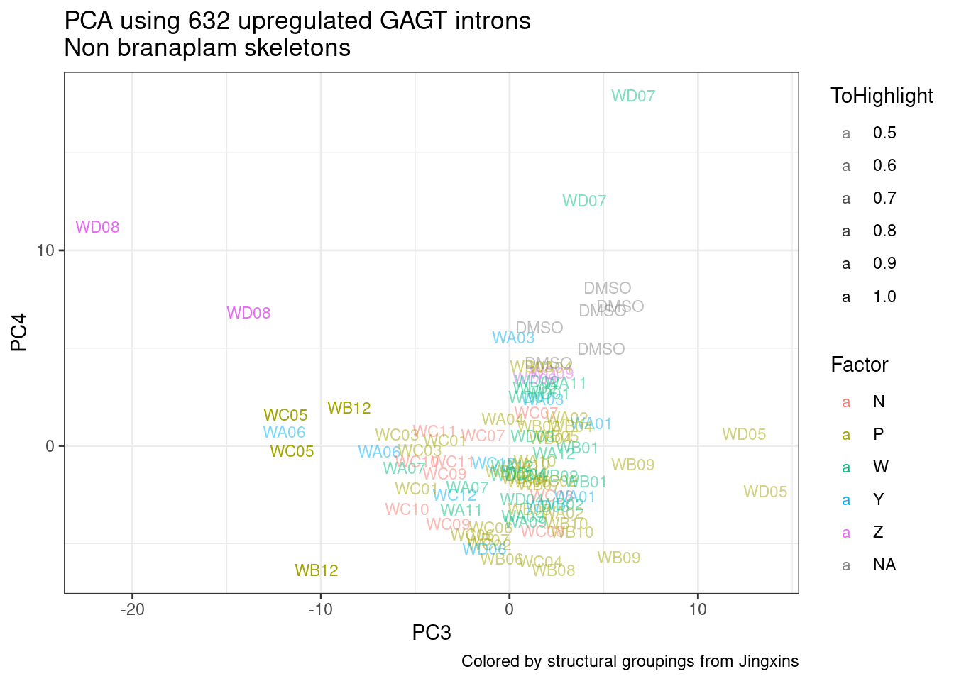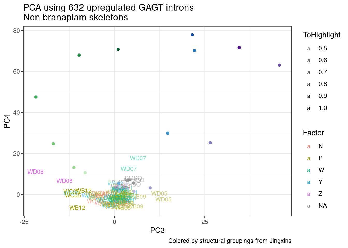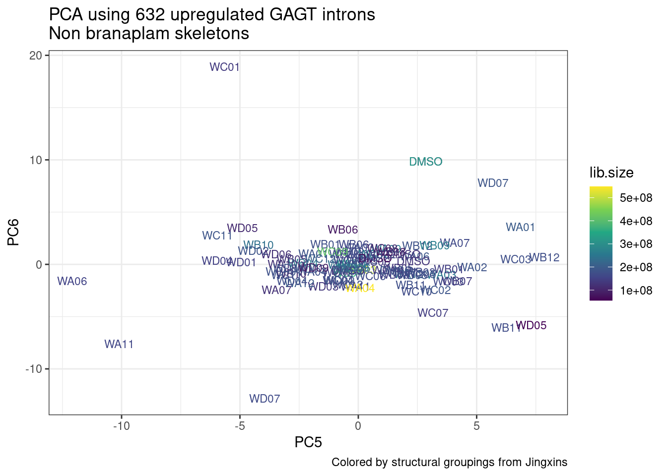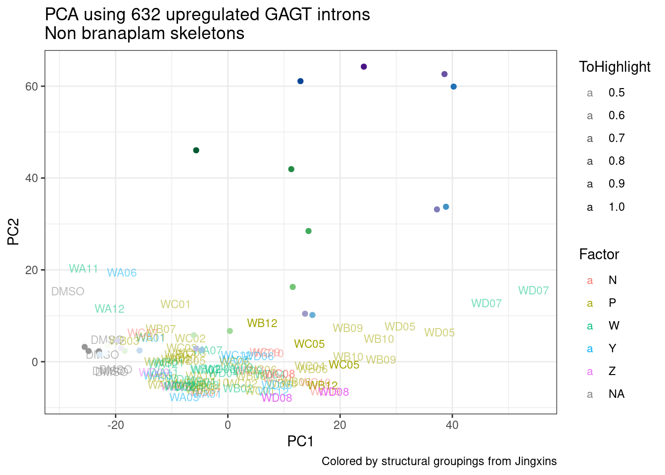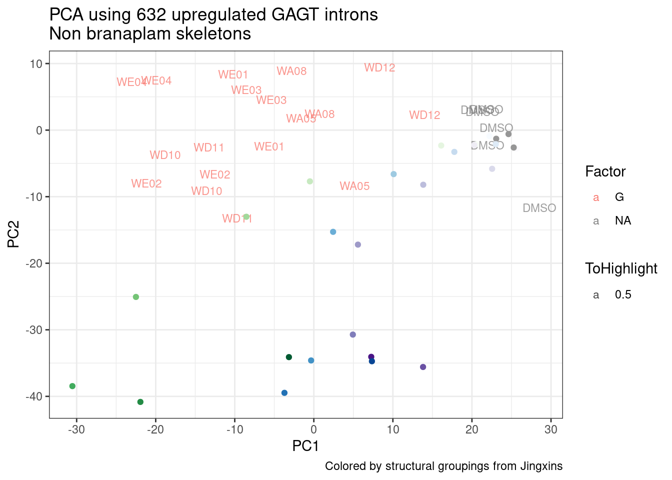 labs(title = "PCA using 632 upregulated GAGT introns\nNon branaplam skeletons", caption="Colored by structural groupings from Jingxins")