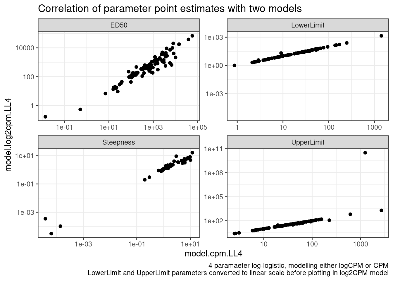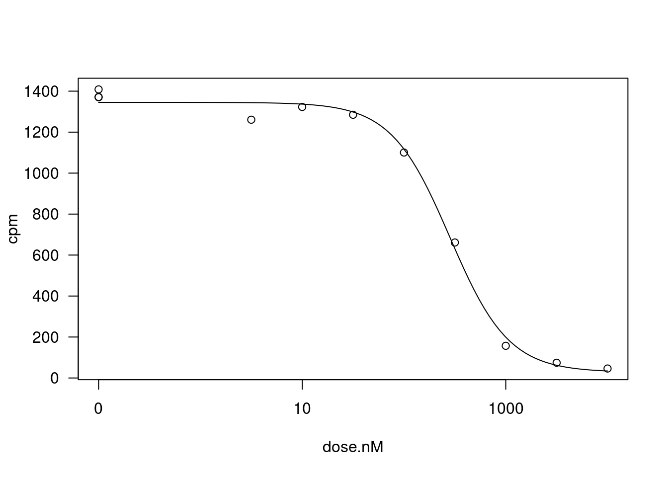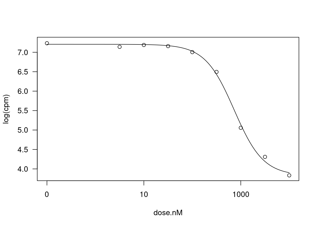 fit <- drm(formula = log2(cpm) ~ dose.nM,