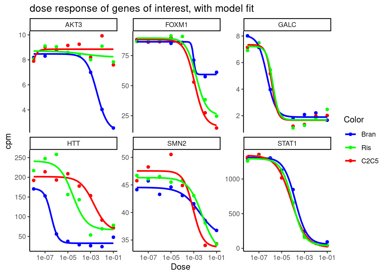 labs(title = "dose response of genes of interest, with model fit") +