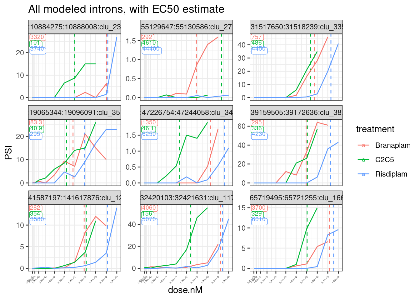 So in here I will do that data tidying, including modelling and estimating EC50 for all GA|GT introns. As in my previous notebook, I will fit a 4-parameter model jointly with all three treatments, fixing the same upper and lower limit parameters, as well as the same slope parameter, and only allowing the EC50 parameter to vary. This is a tutorial I found useful to understand details about fitting these models with drc package. I will use PSI as the response. In some sense, this may be unideal, and using the log-transformed junction excision ratio with a small pseudocount might be better for the future, to keep errors more normally distributed and reasonable heterskedasticity. But PSI is easily interpretable and also, from my experience fitting these models to gene expression with logCPM versus CPM, I think these various possibly transforms of the response variable won’t bias or make much difference to the EC50 parameter estimate - it’s really the standard error that is sensitive to these things. So for simplicity, interpretabiliy, and so I can quickly copy/paste some code, I will keep using PSI as the response variable.
