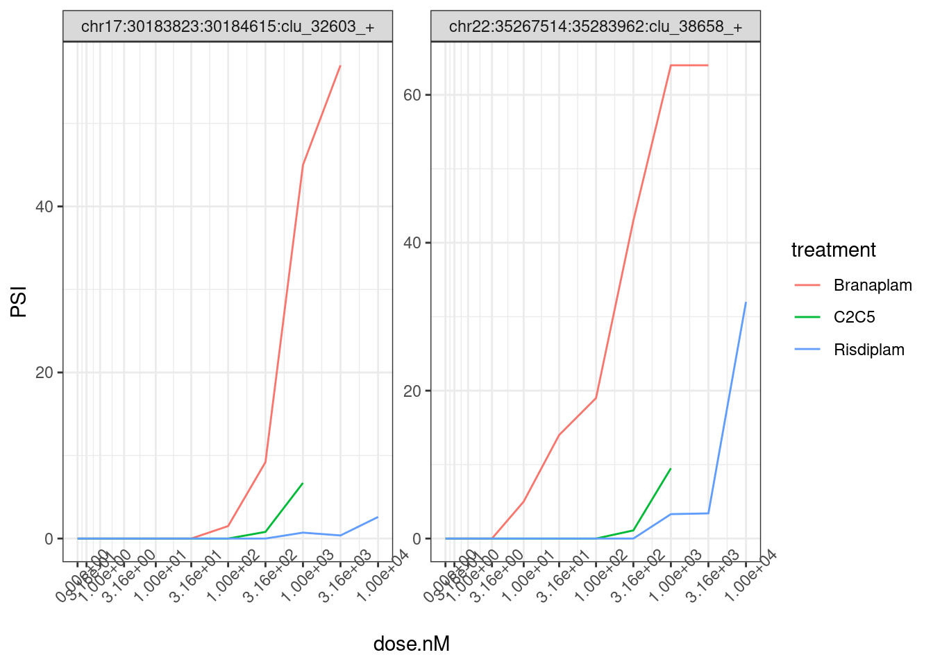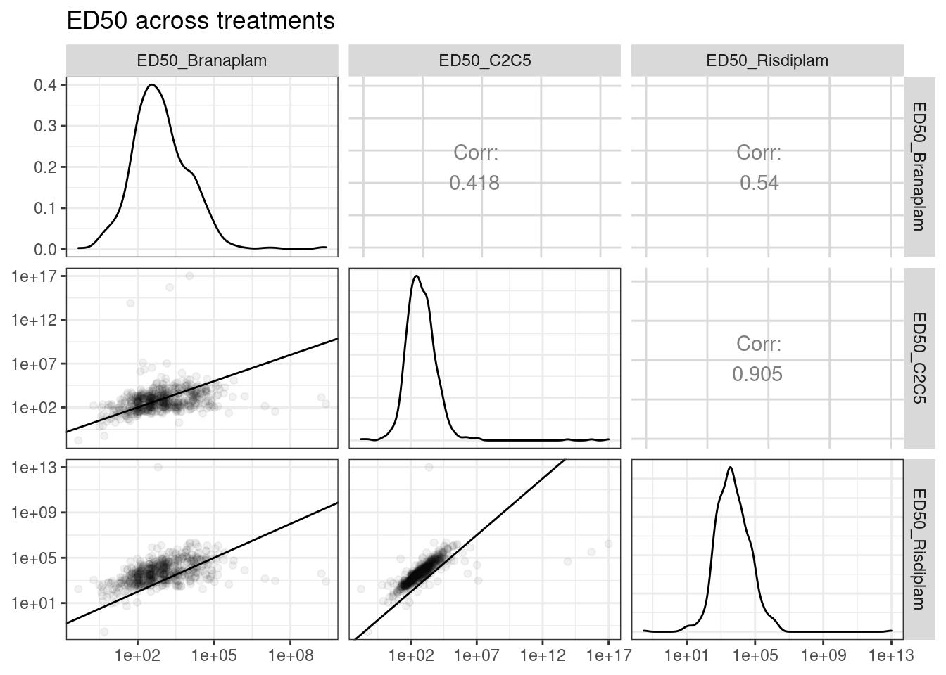 Ok, so keep in mind the offset from the diagonal is somewhat expected, as the ED50 units are in nanomolar and these drugs have different genome-wide effective concentrations. And as expected, the C2C5 looks a lot like risdiplam.