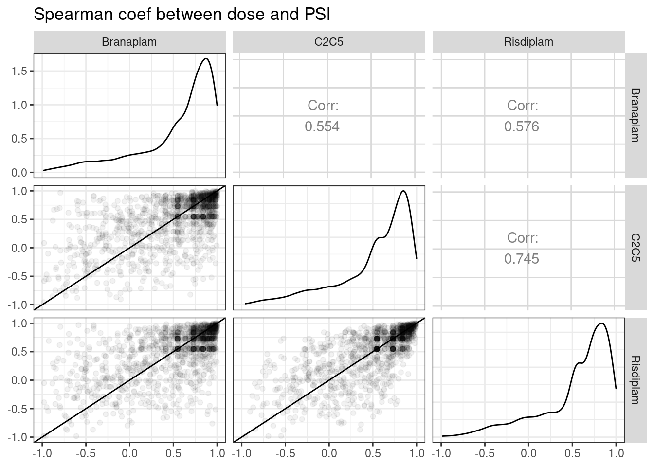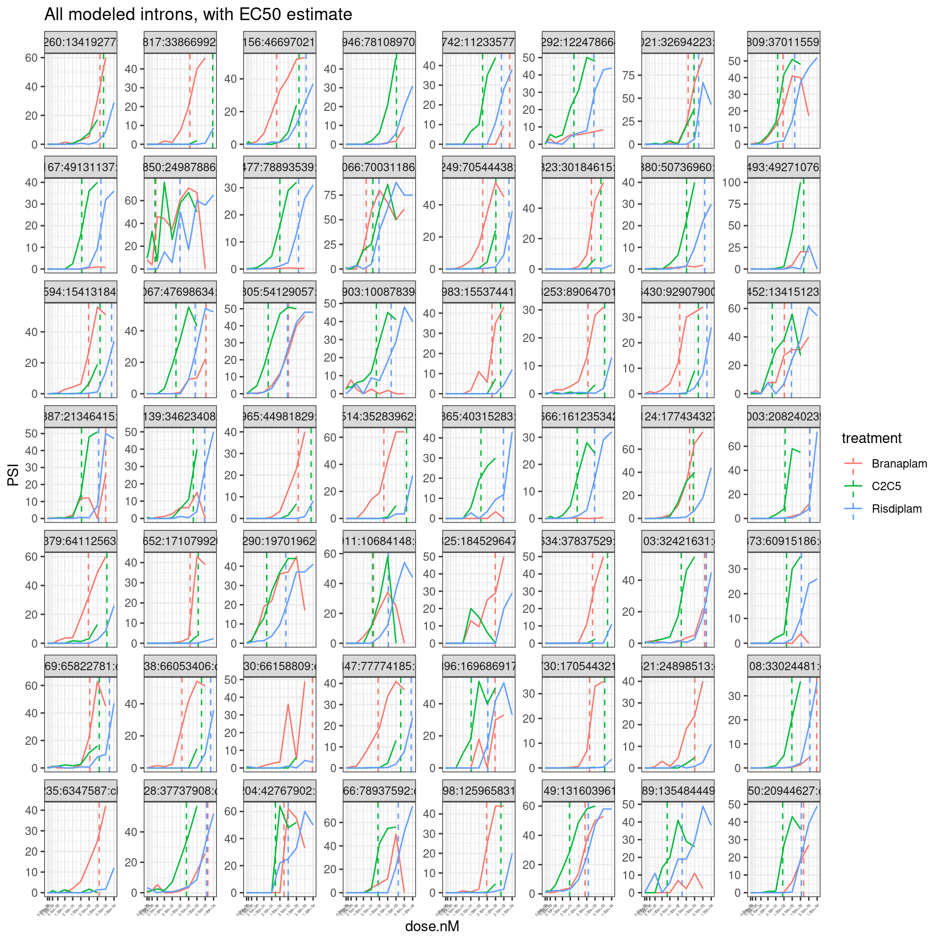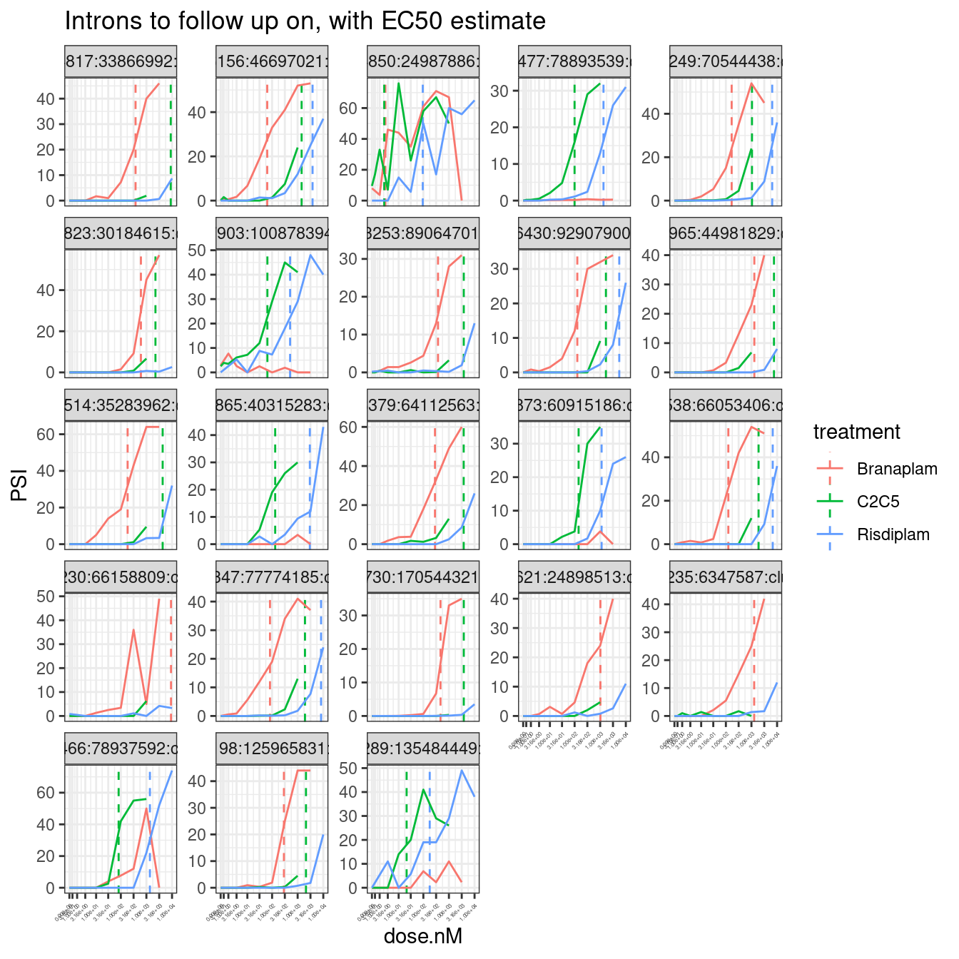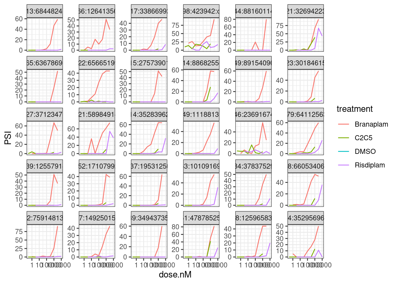 - The most intriguing part of the dose-response (DR) study is the selectivity difference between risdiplam and branaplam. Due to the similarity between risdiplam and C2-C5-1, we can even leave C2-C5-1 out for simplicity. We need a list of more genes that are (a) risdiplam selective and (b) branaplam selective, with complete coordinates. The criteria I can think of are as follows: