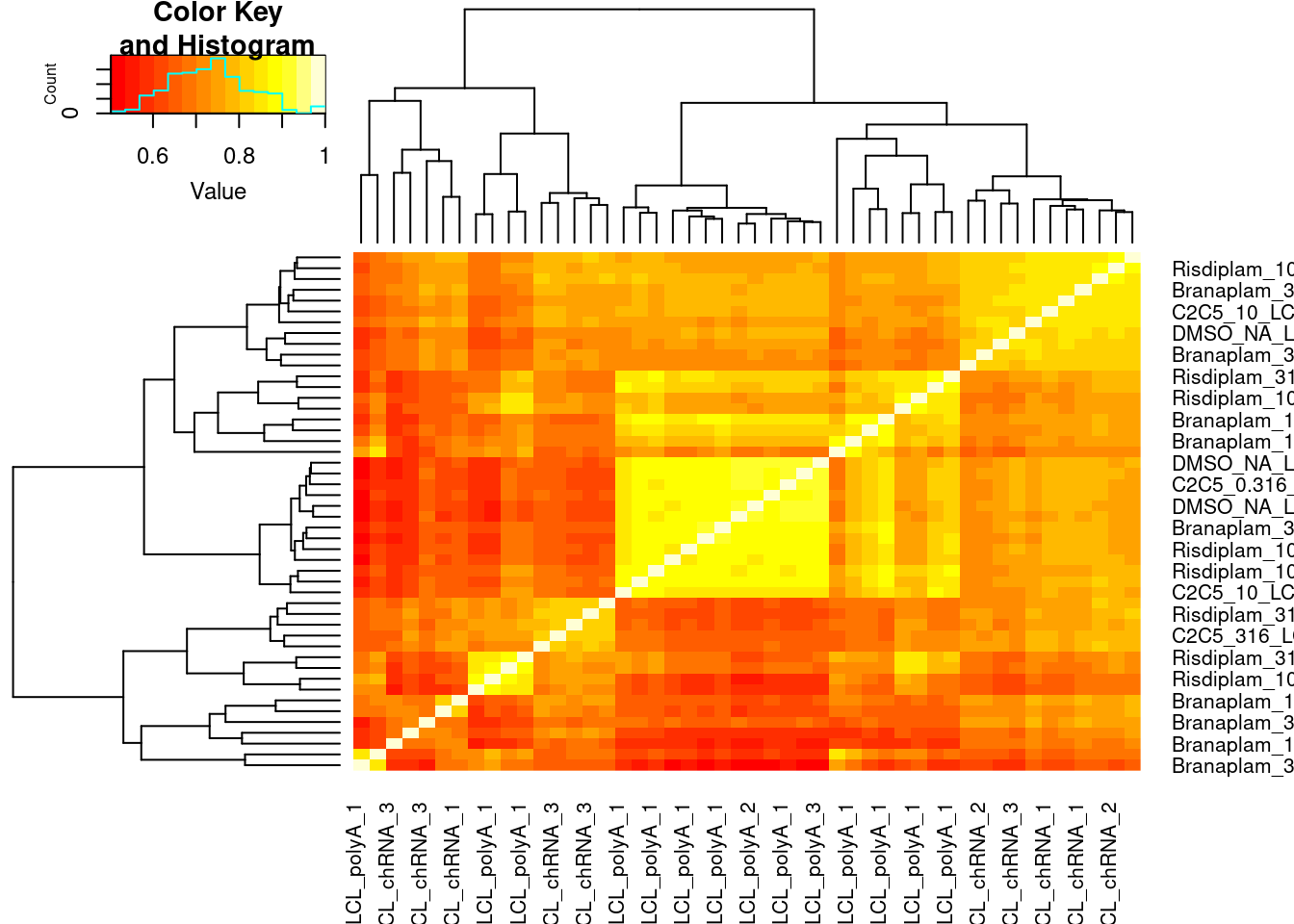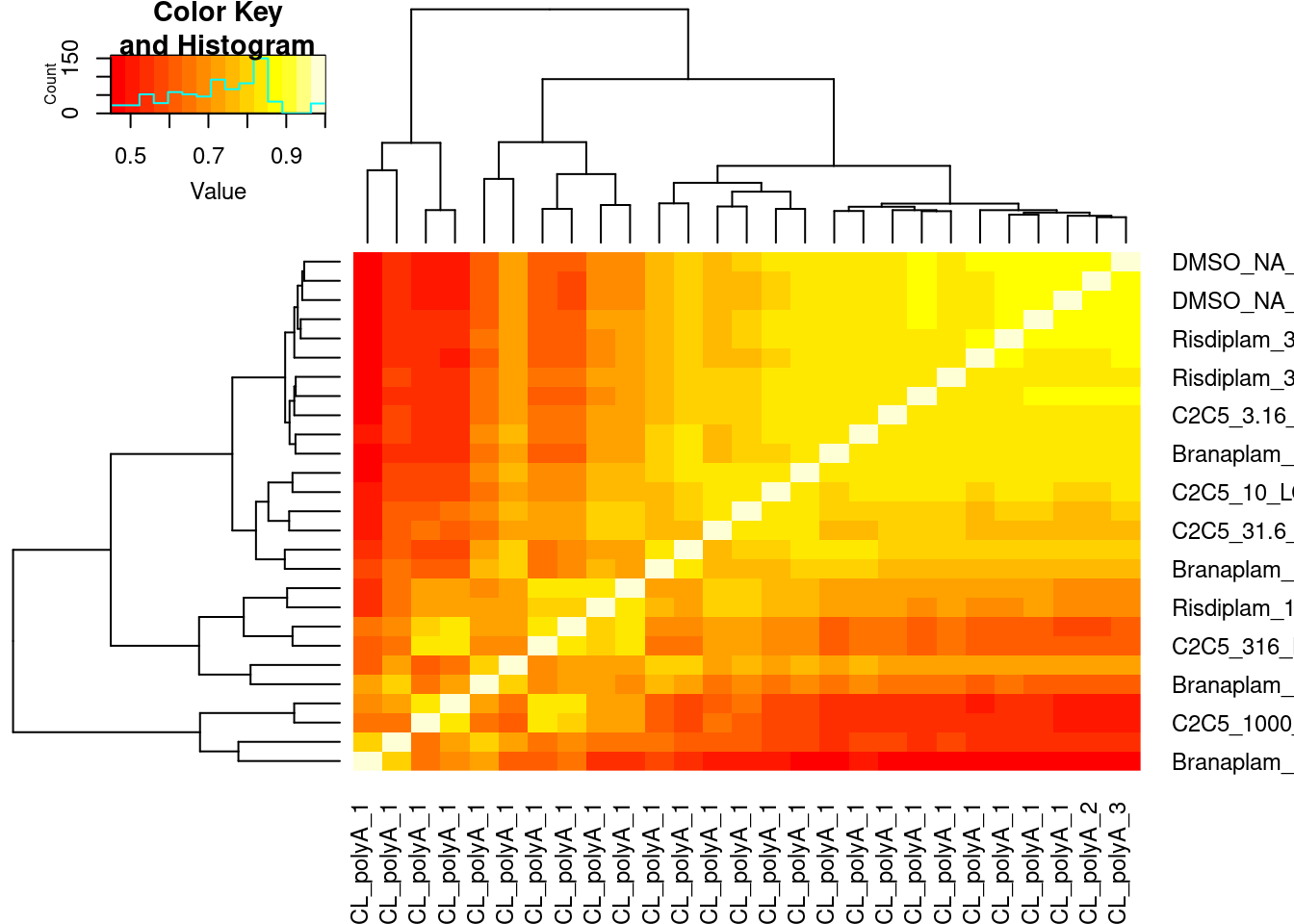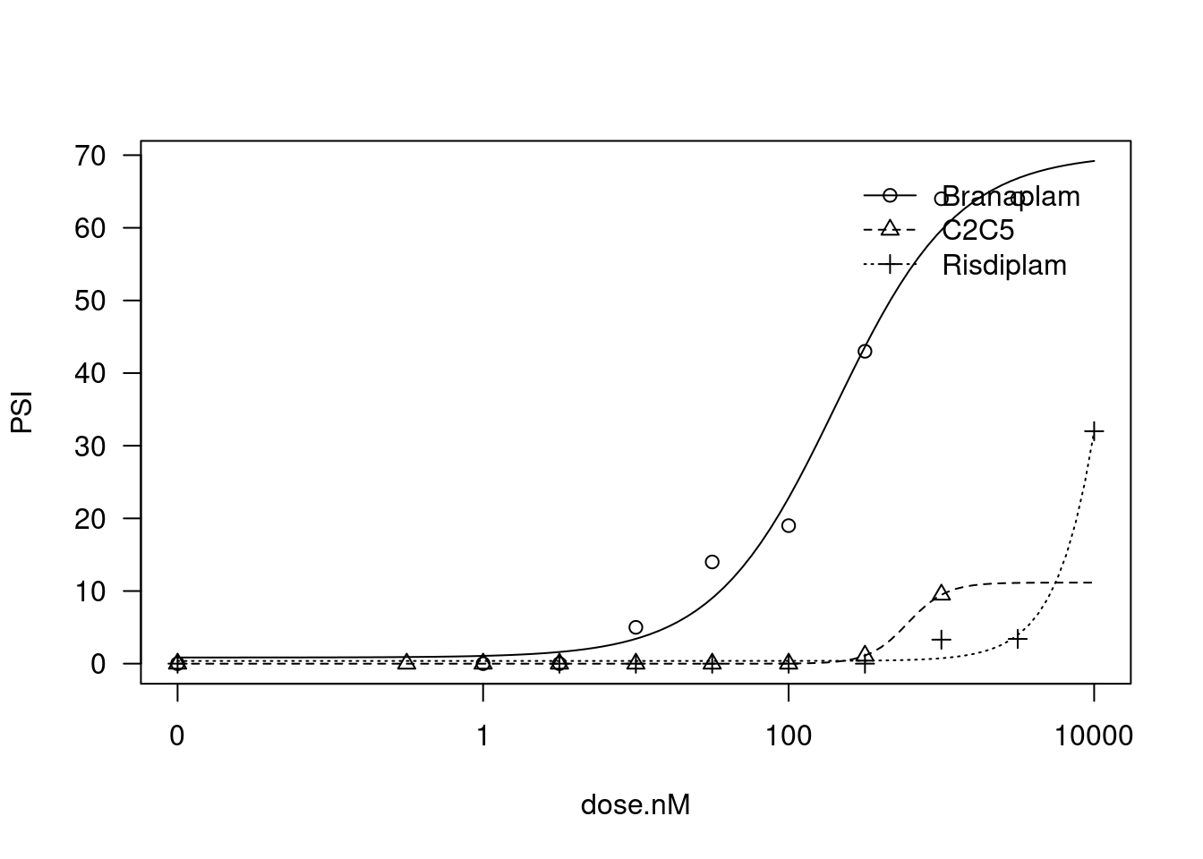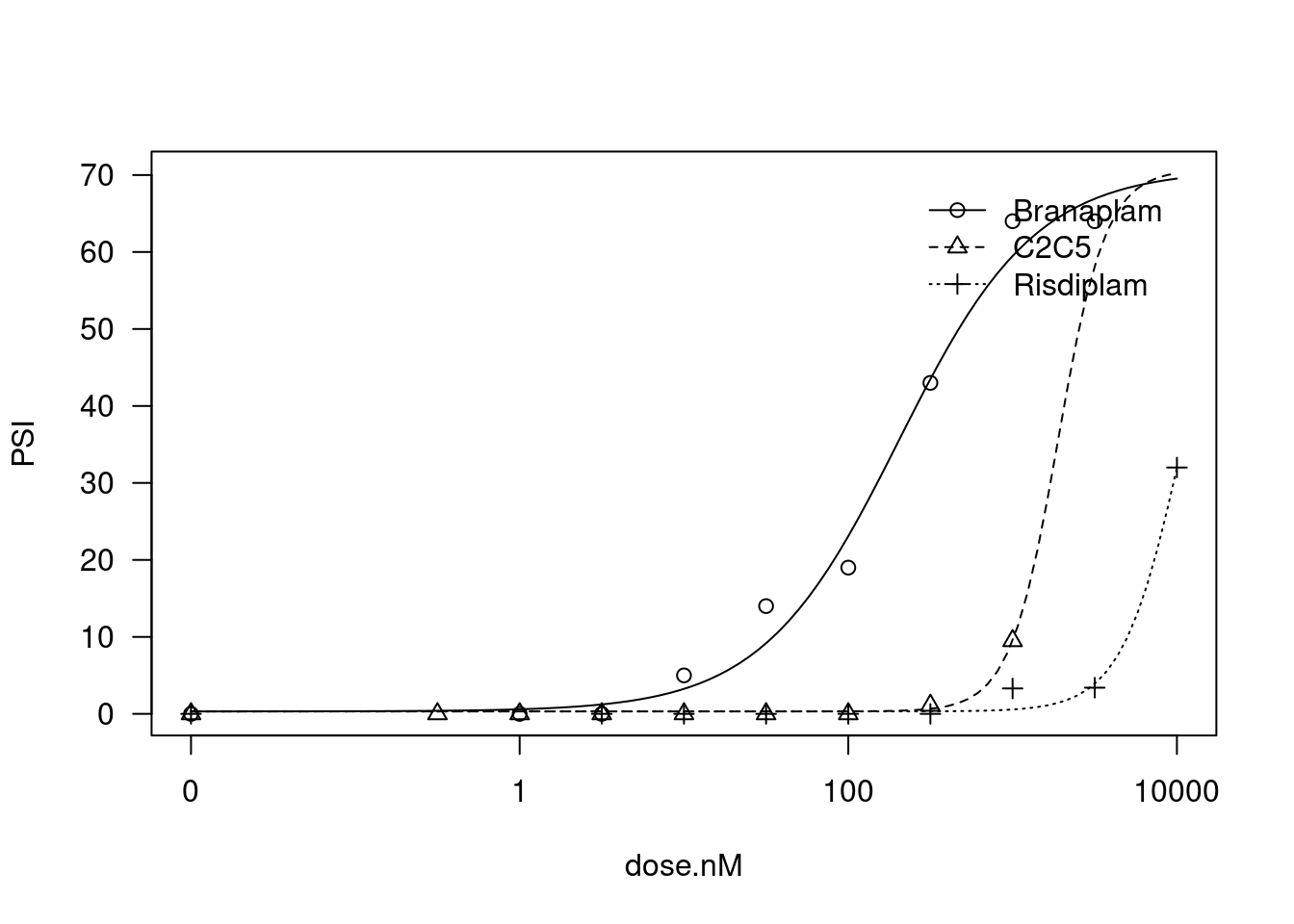 - The most intriguing part of the dose-response (DR) study is the selectivity difference between risdiplam and branaplam. Due to the similarity between risdiplam and C2-C5-1, we can even leave C2-C5-1 out for simplicity. We need a list of more genes that are (a) risdiplam selective and (b) branaplam selective, with complete coordinates. The criteria I can think of are as follows: