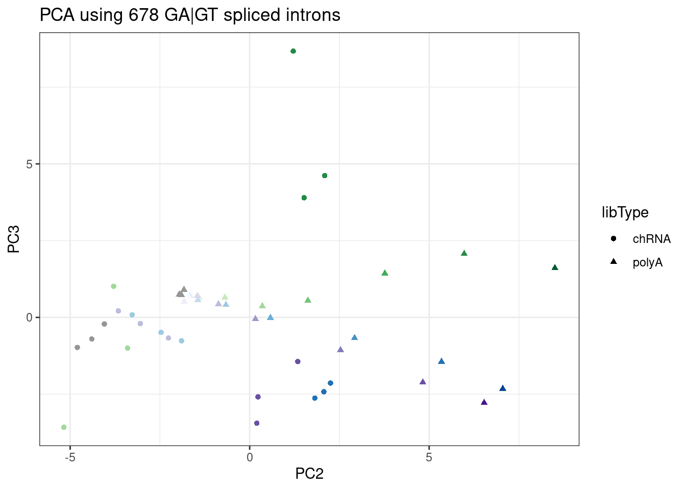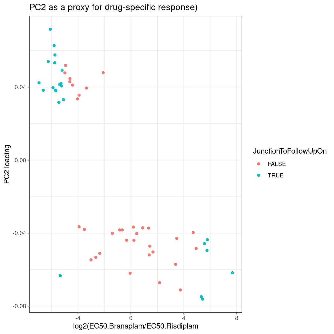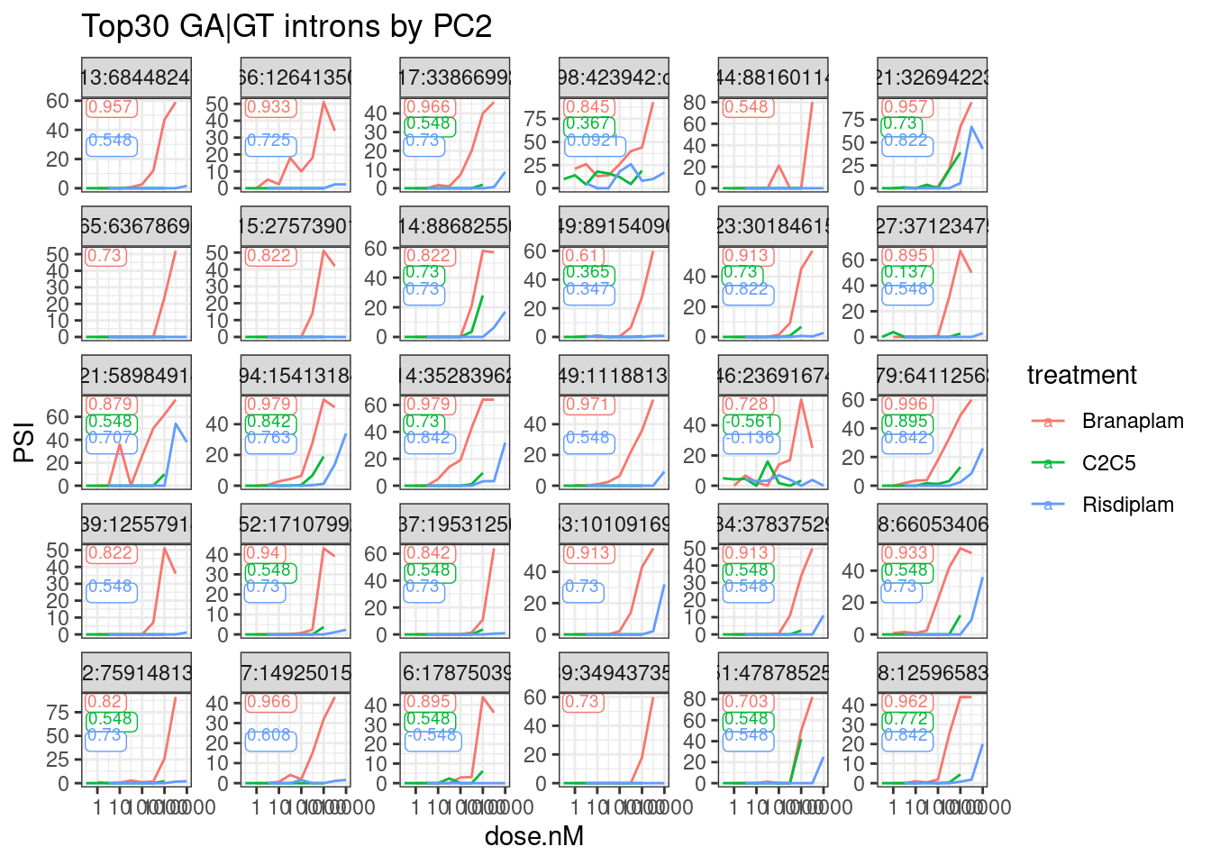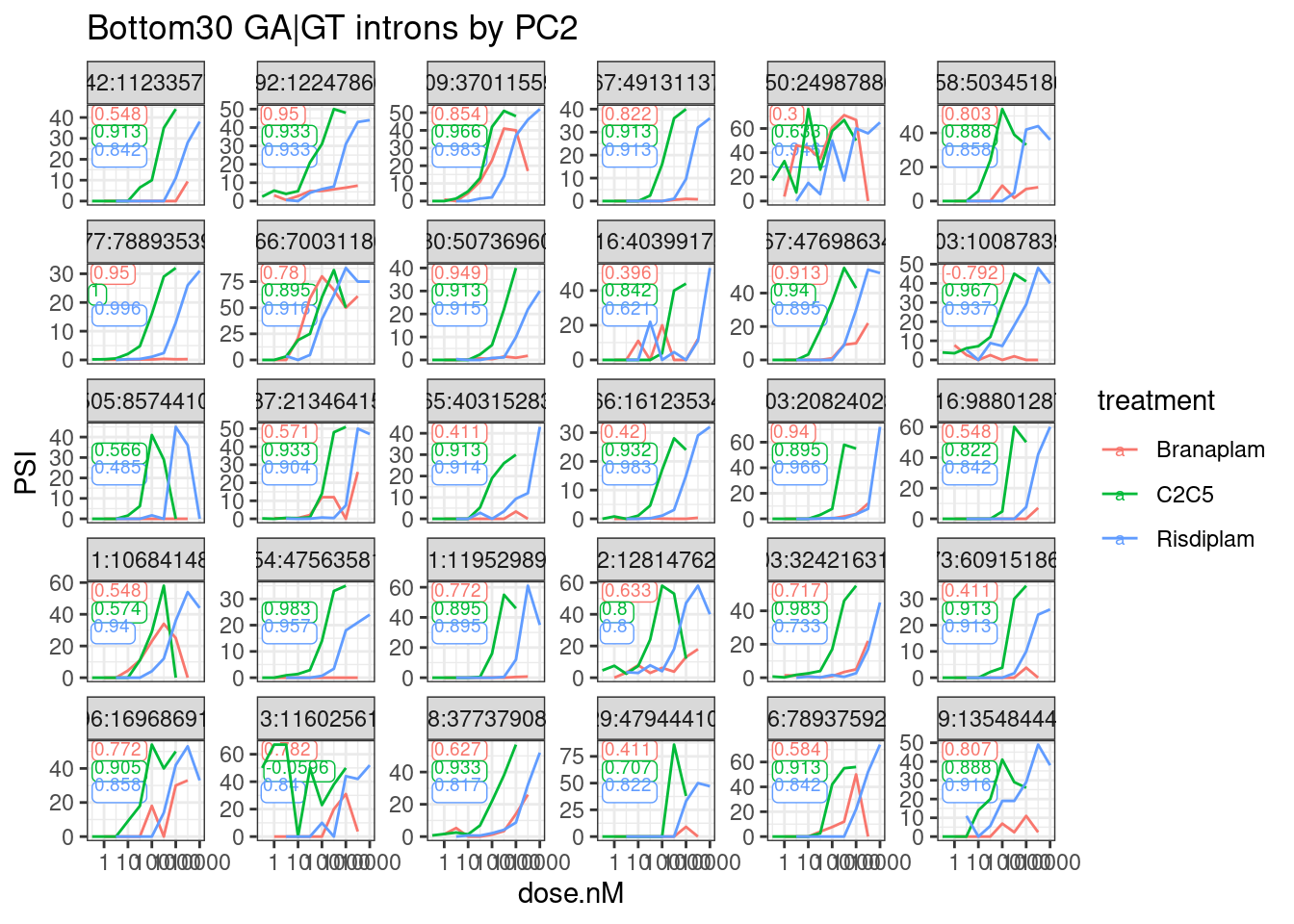 Here I’ll address #2. Previously, based on the LCL dose-response data, I identified branaplam specific introns just by the loading of PC2 on a PCA analysis, as this PC seemed to distinguish branaplam-specific from C2C5/risdiplam-specific effects. I’ll do something similarly ad hoc, and incorporating some of Jingxin’s suggestions, to come up with a list of intron coordiantes worth cloning…