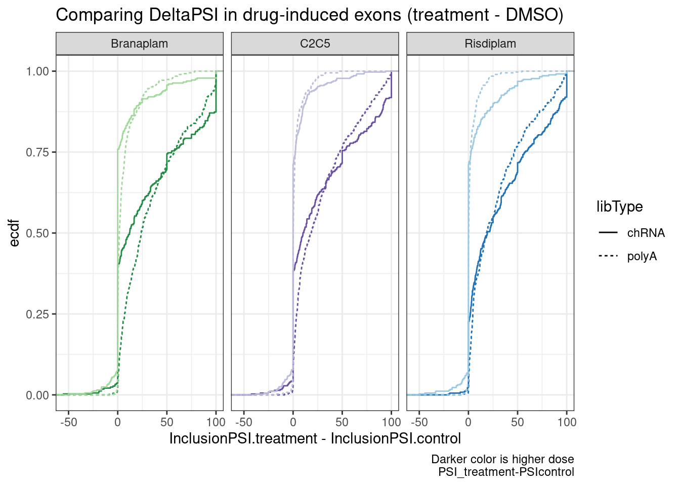 labs(y="ecdf", x="SpicingEfficiency", caption=str_wrap("Comparing introns hosting the drug-induced cassette exons to all introns within the same set of genes", 50))