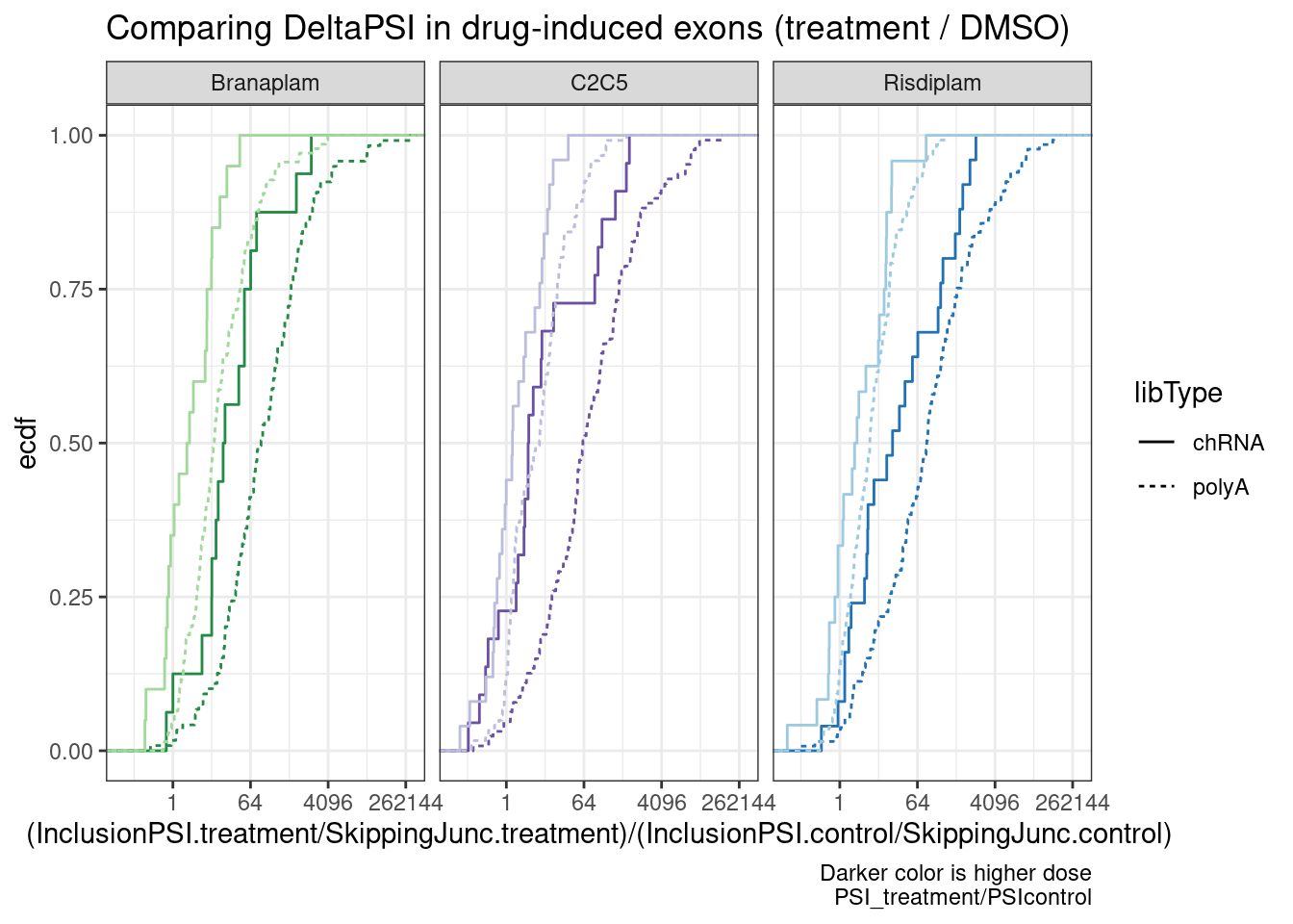 labs(y="ecdf", x="IntronExcisionRatio", caption=str_wrap("Comparing introns hosting the drug-induced cassette exons to all introns within the same set of genes", 50))