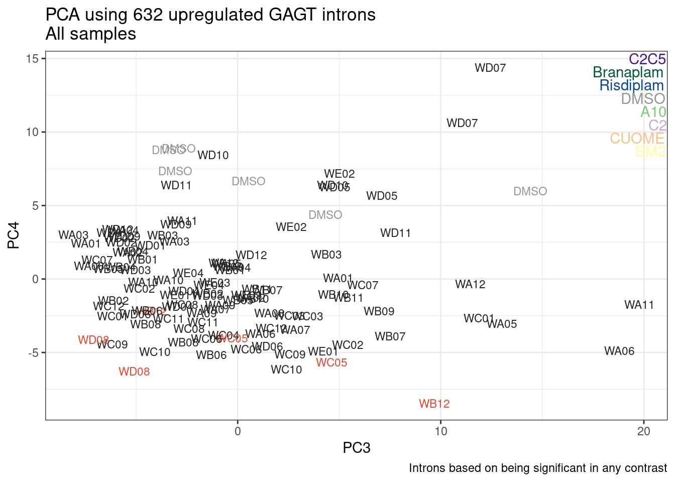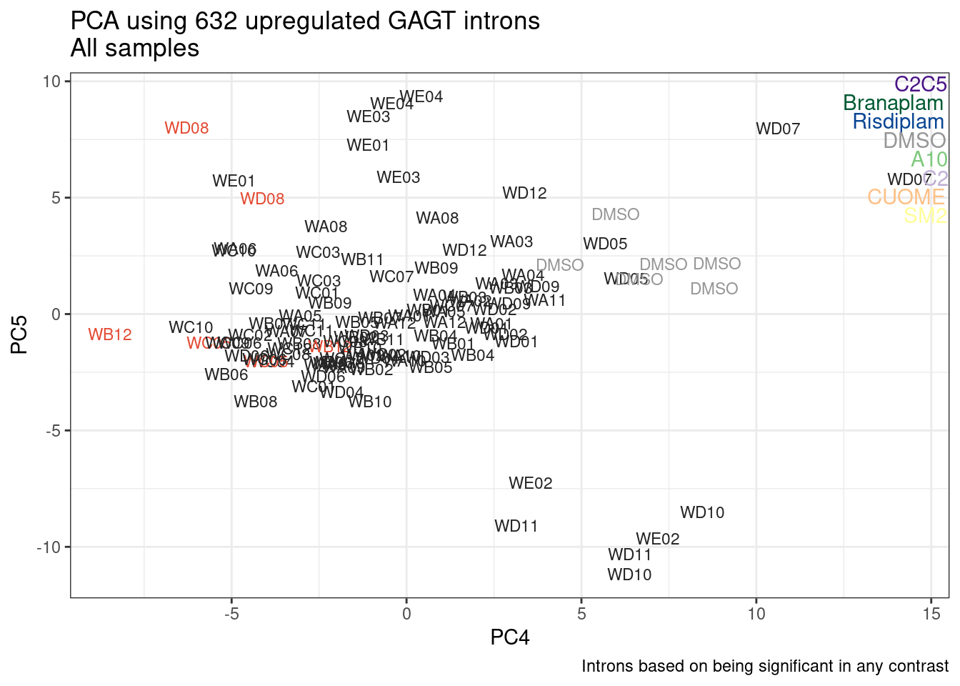These 4 genes are examples of how these red treatments may sometimes be more branaplam like on some genes, and more risdiplam like on others. Now let’s try and find the GA-GT introns drivers for these genes…