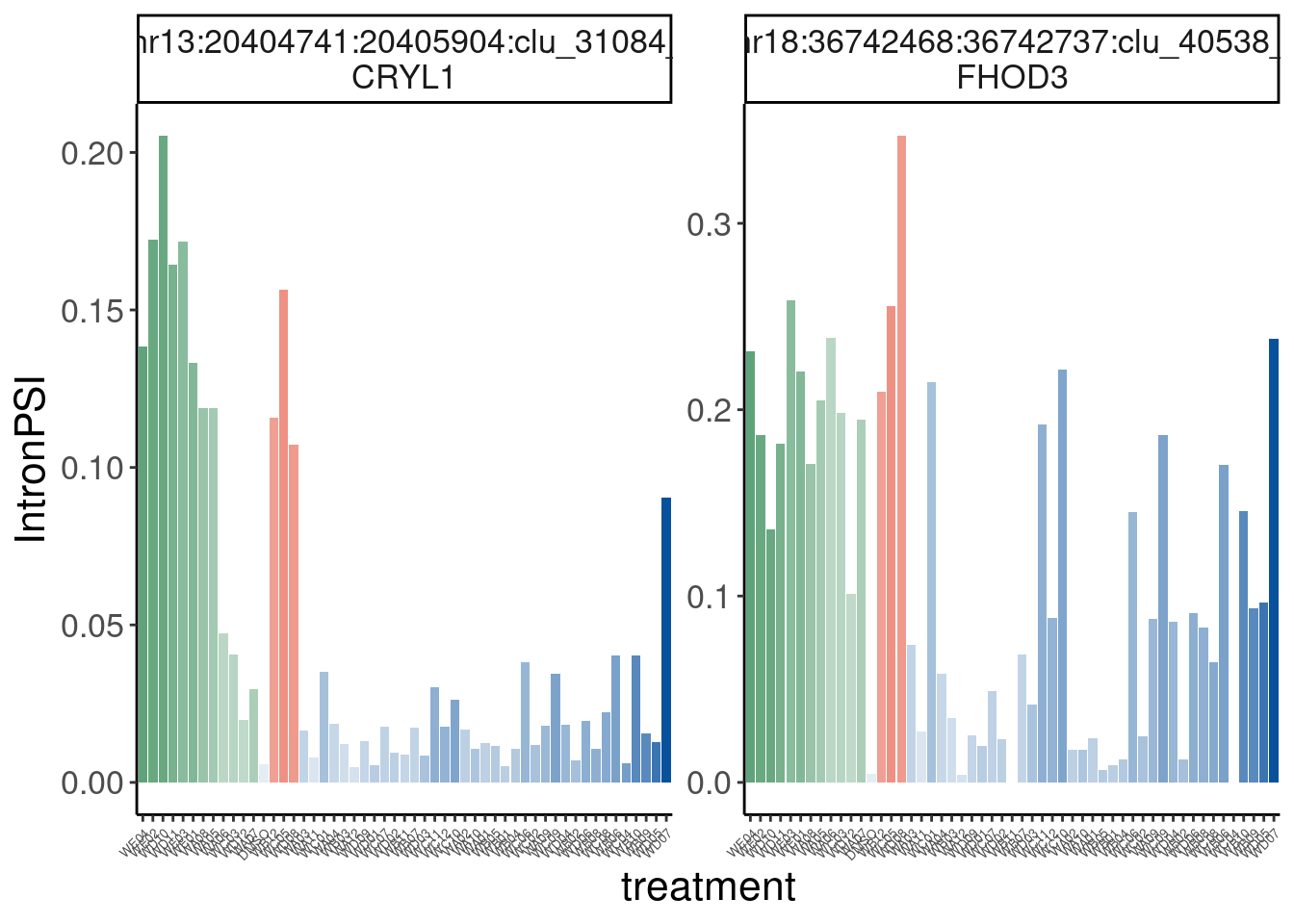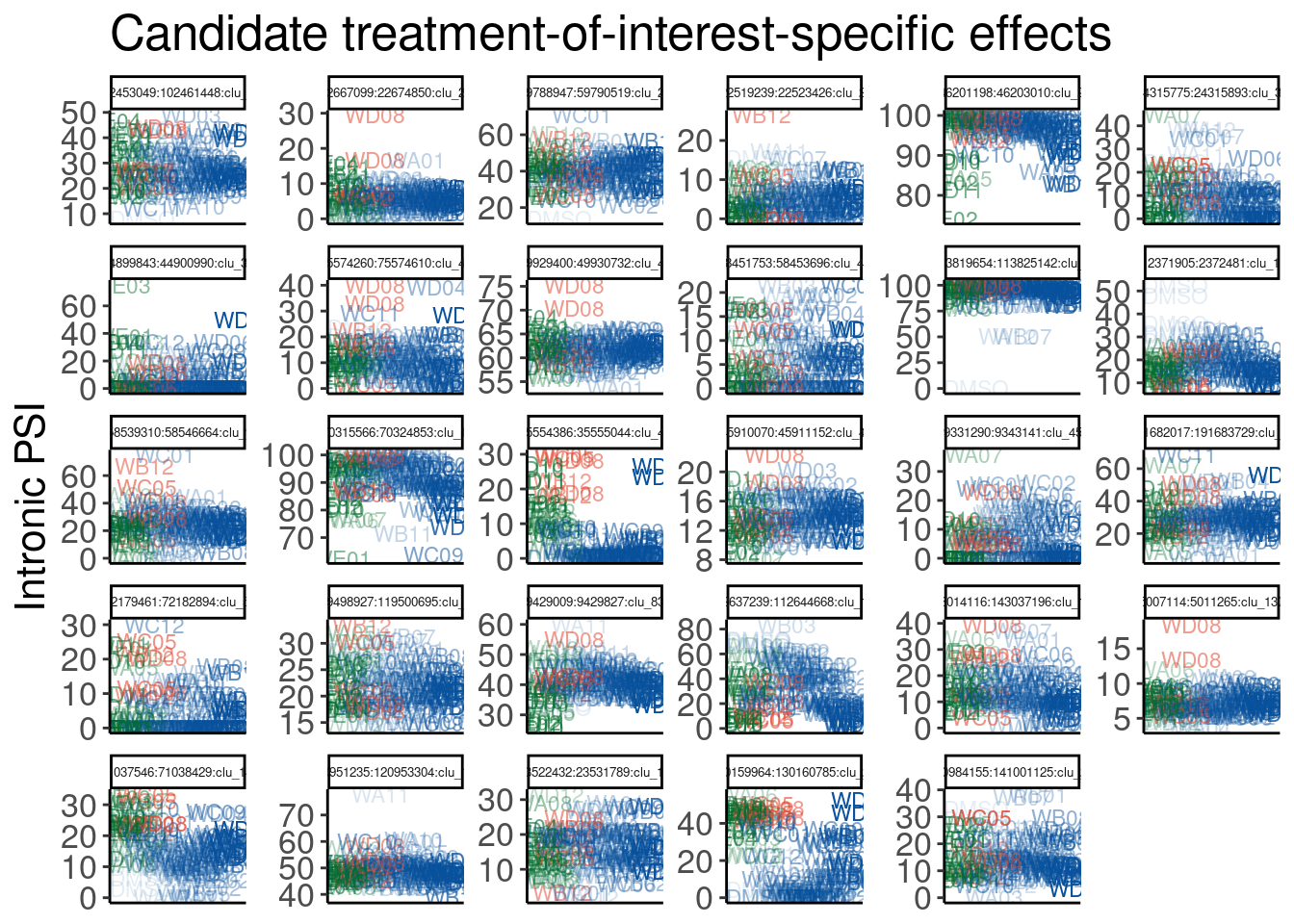 labs(title="Candidate treatment-of-interest-specific effects", x="Treatments, roughly in order", y="Intronic PSI")