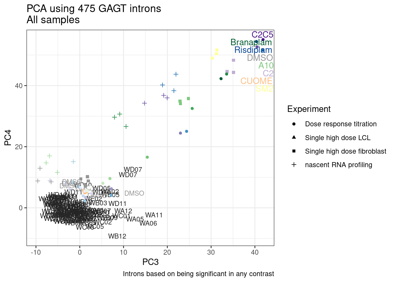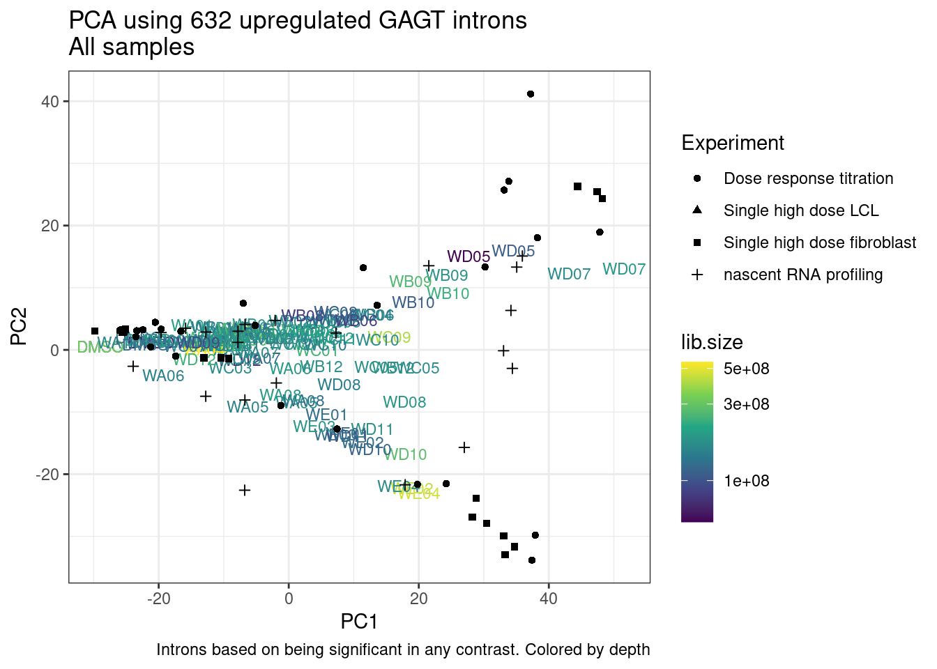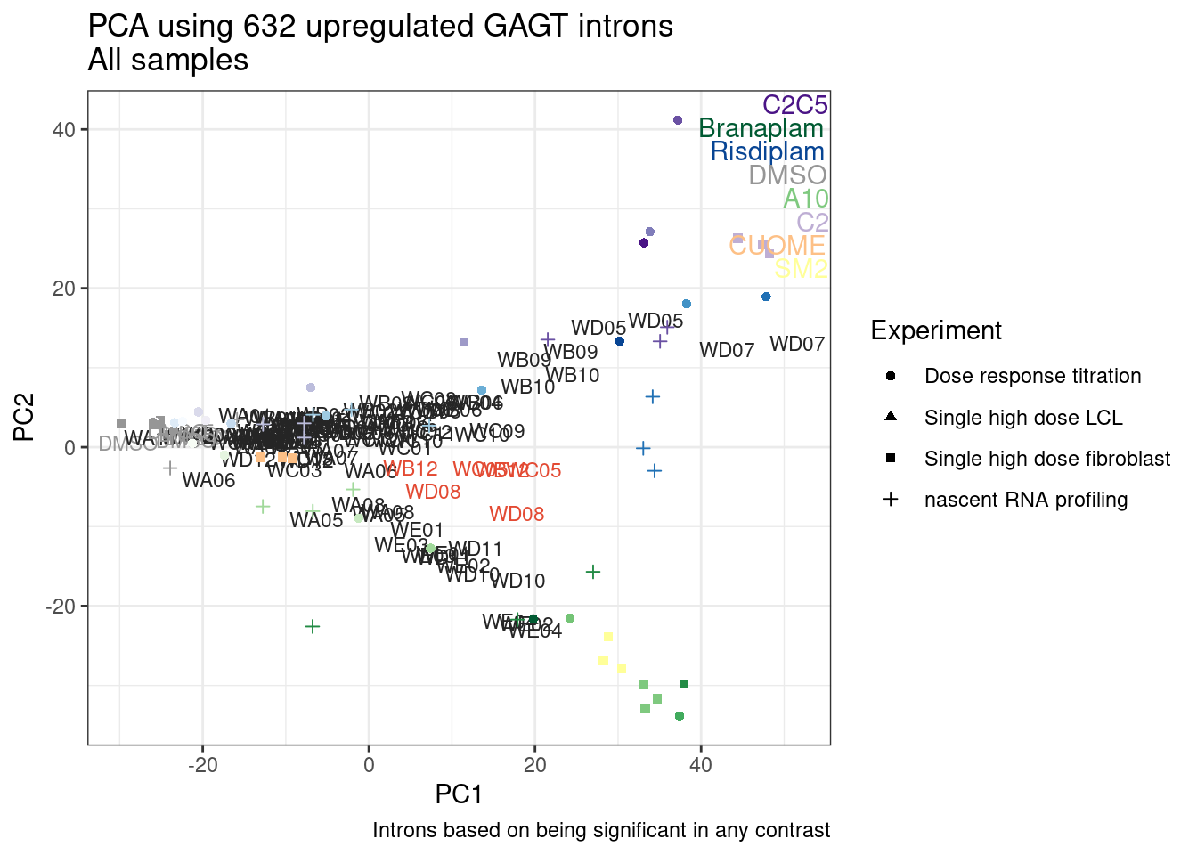 labs(title = "PCA using 632 upregulated GAGT introns\nAll samples", caption="Colored consistent in other plots")