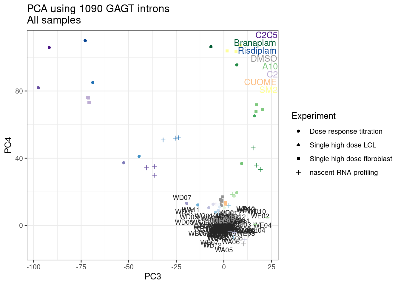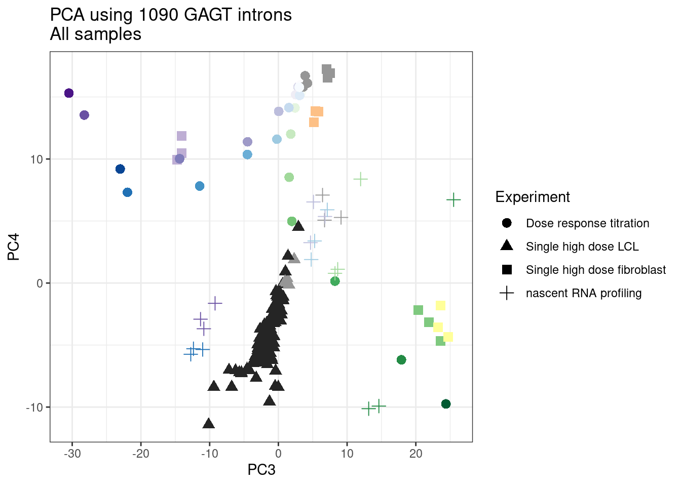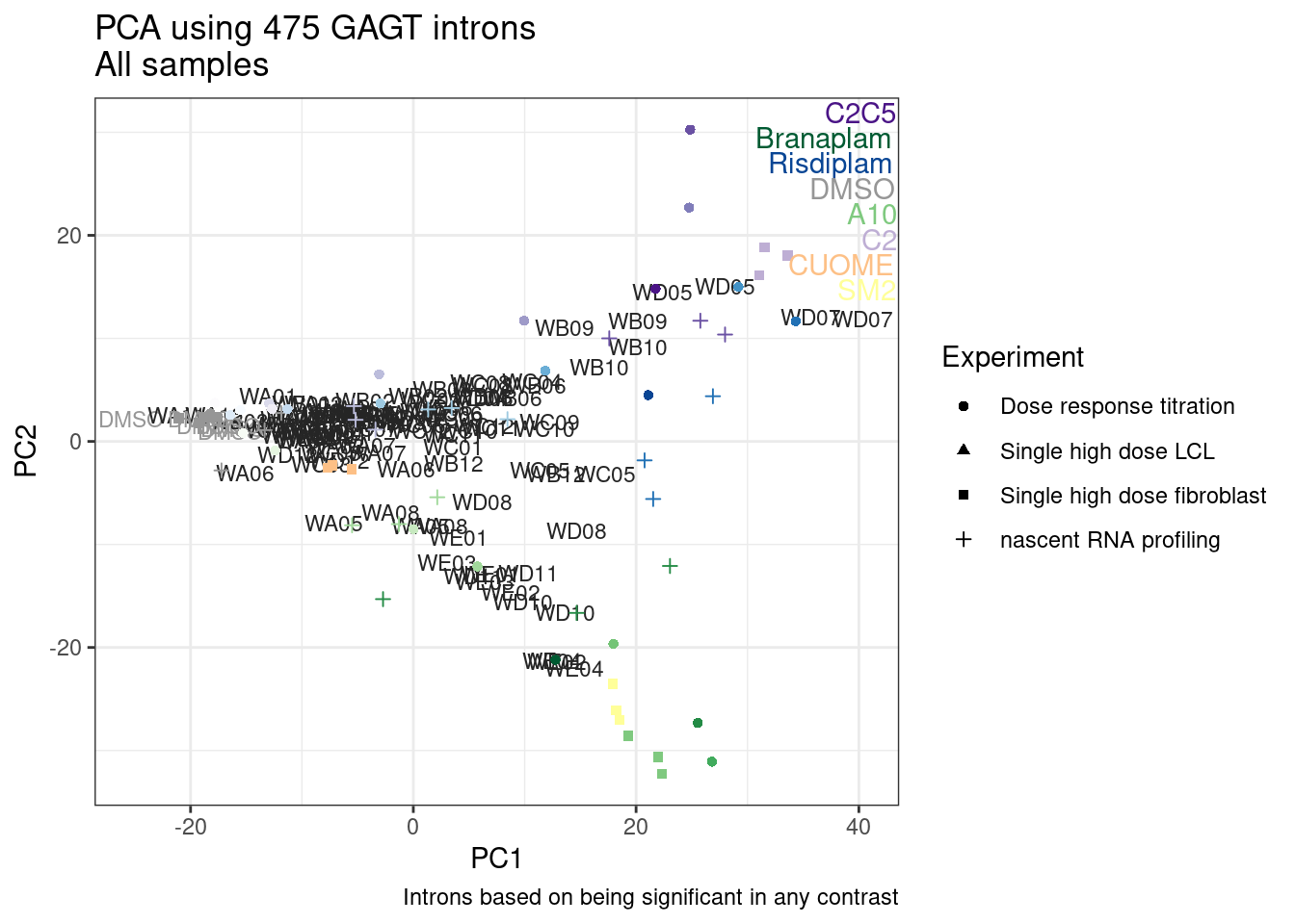 labs(title = "PCA using 632 upregulated GAGT introns\nAll samples", caption="Colored consistent in other plots")
