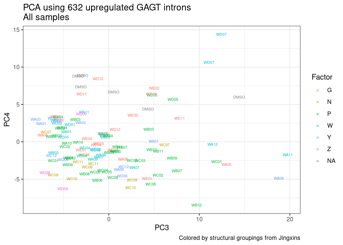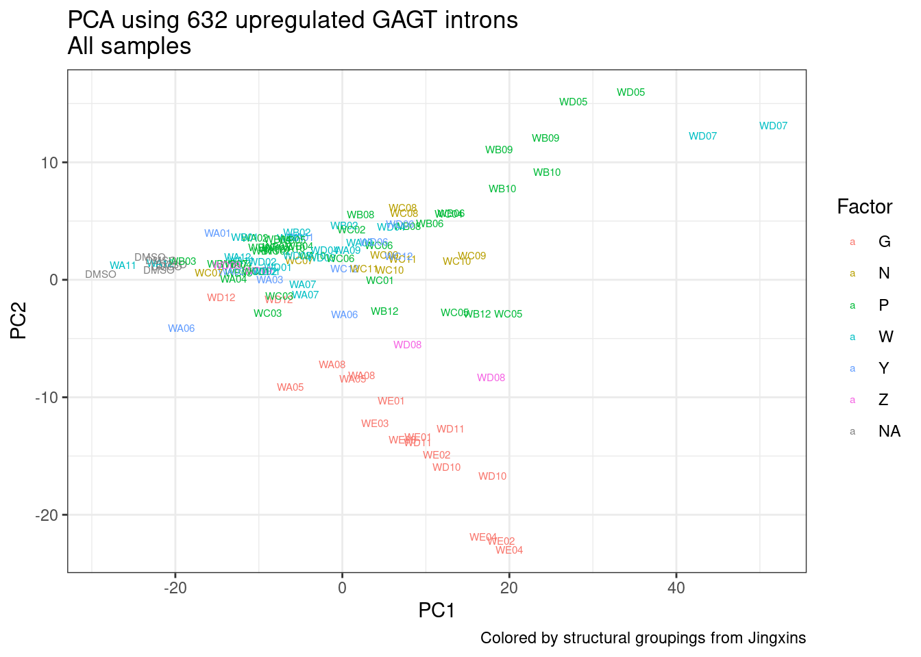 labs(title = "PCA using 632 upregulated GAGT introns\nAll samples", caption="Colored by structural groupings from Jingxins")