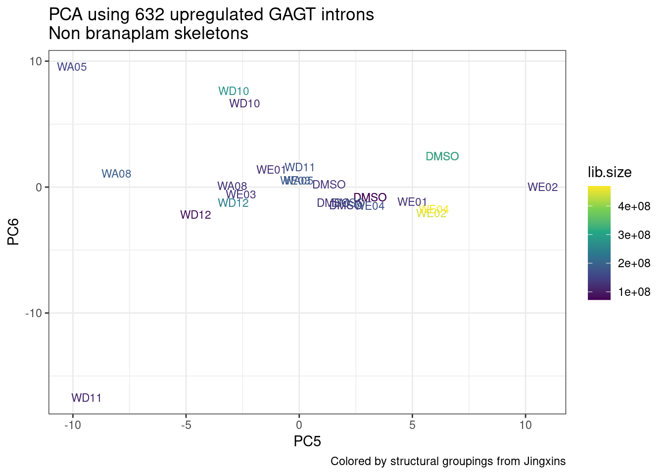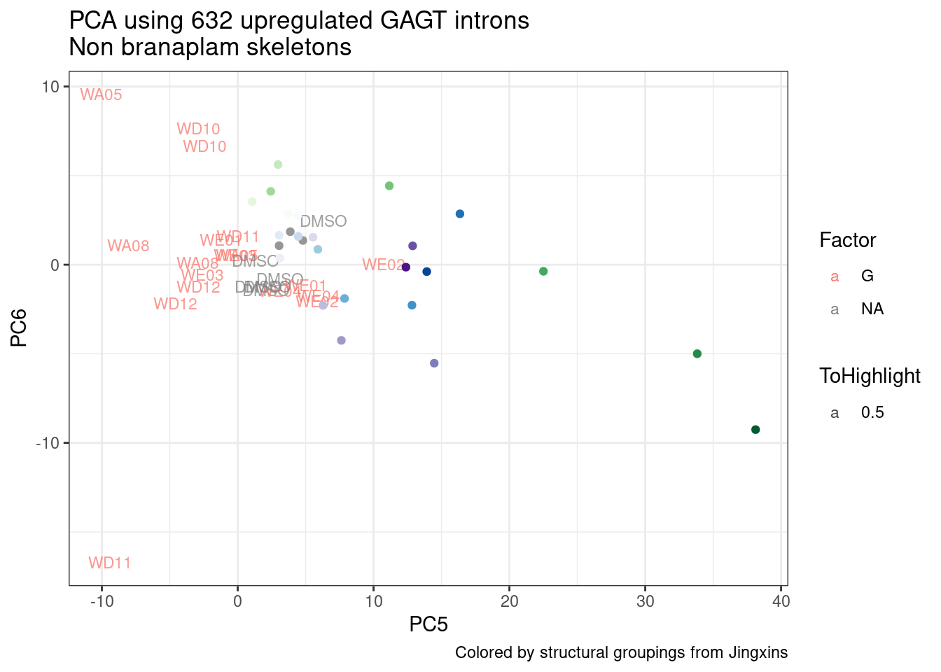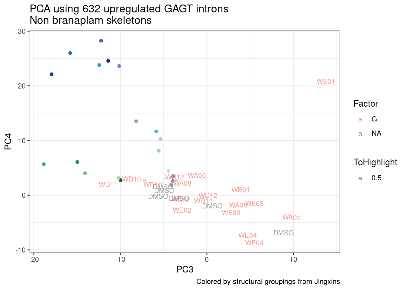 labs(title = "PCA using 632 upregulated GAGT introns\nNon branaplam skeletons", caption="Colored by structural groupings from Jingxins")