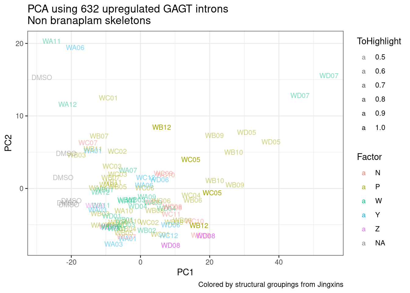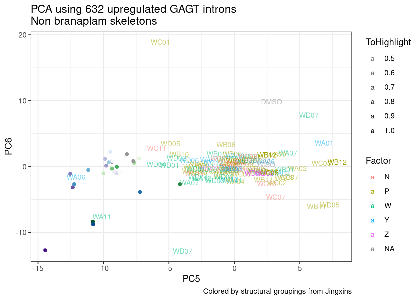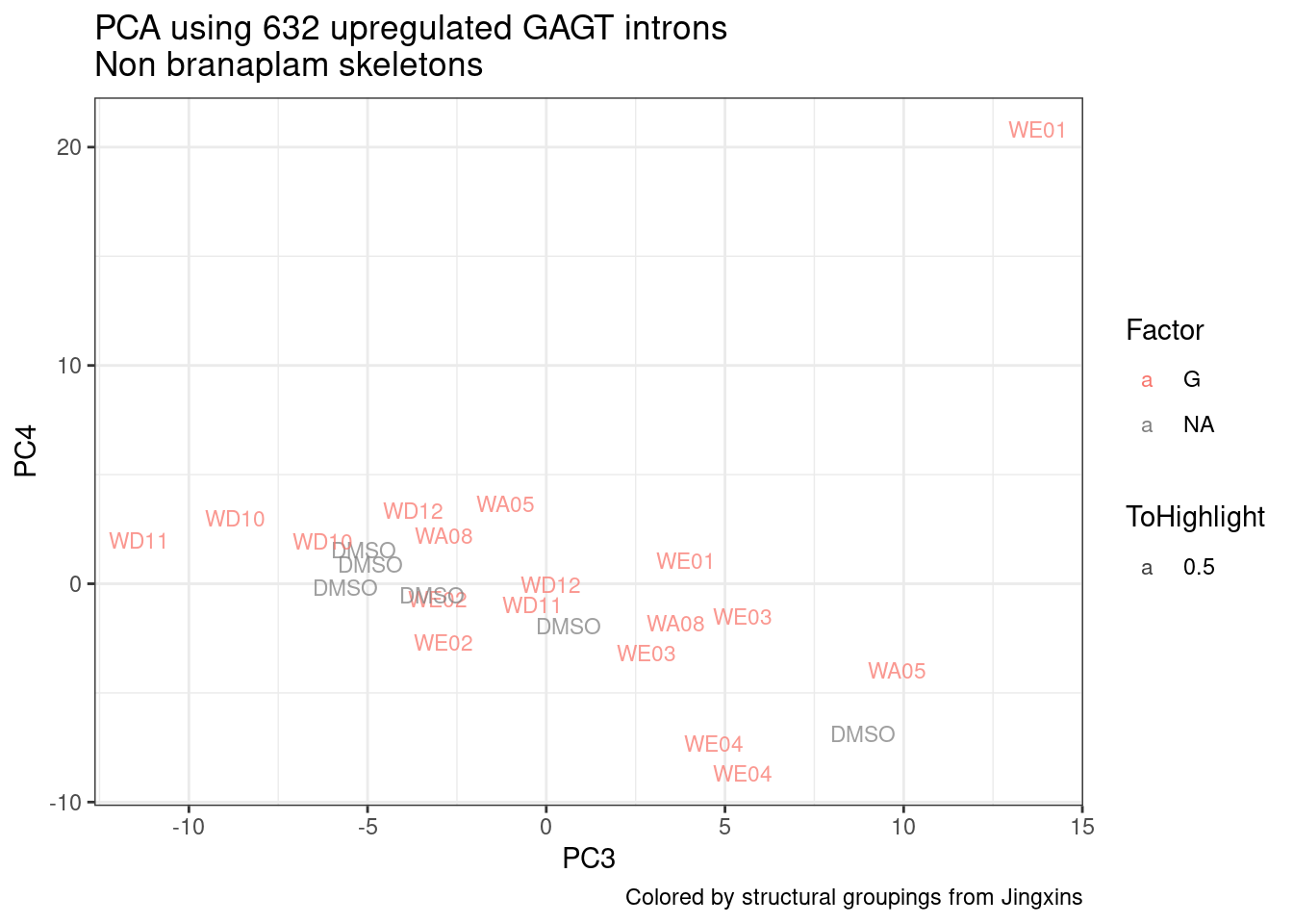 labs(title = "PCA using 632 upregulated GAGT introns\nNon branaplam skeletons", caption="Colored by structural groupings from Jingxins")