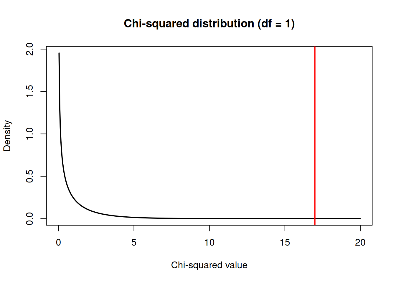X-squared = 16.99, df = 1, p-value = 3.758e-05