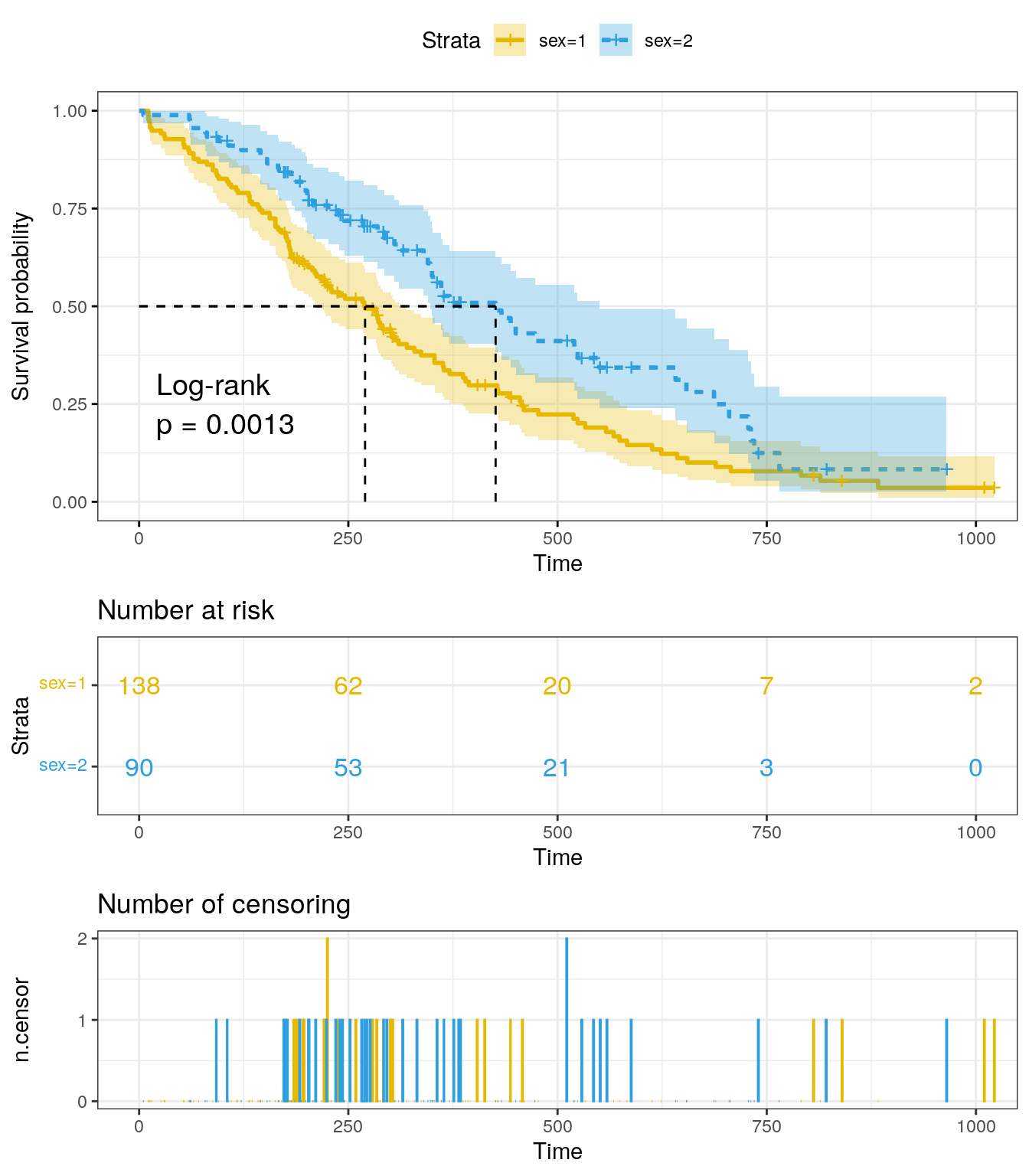 legend.labs=c("Sex=1", "Sex=2"),