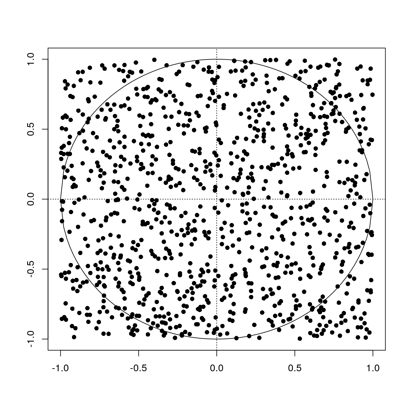 Now we randomly generate 1,000 (x,y) coordinates within the unit circle.