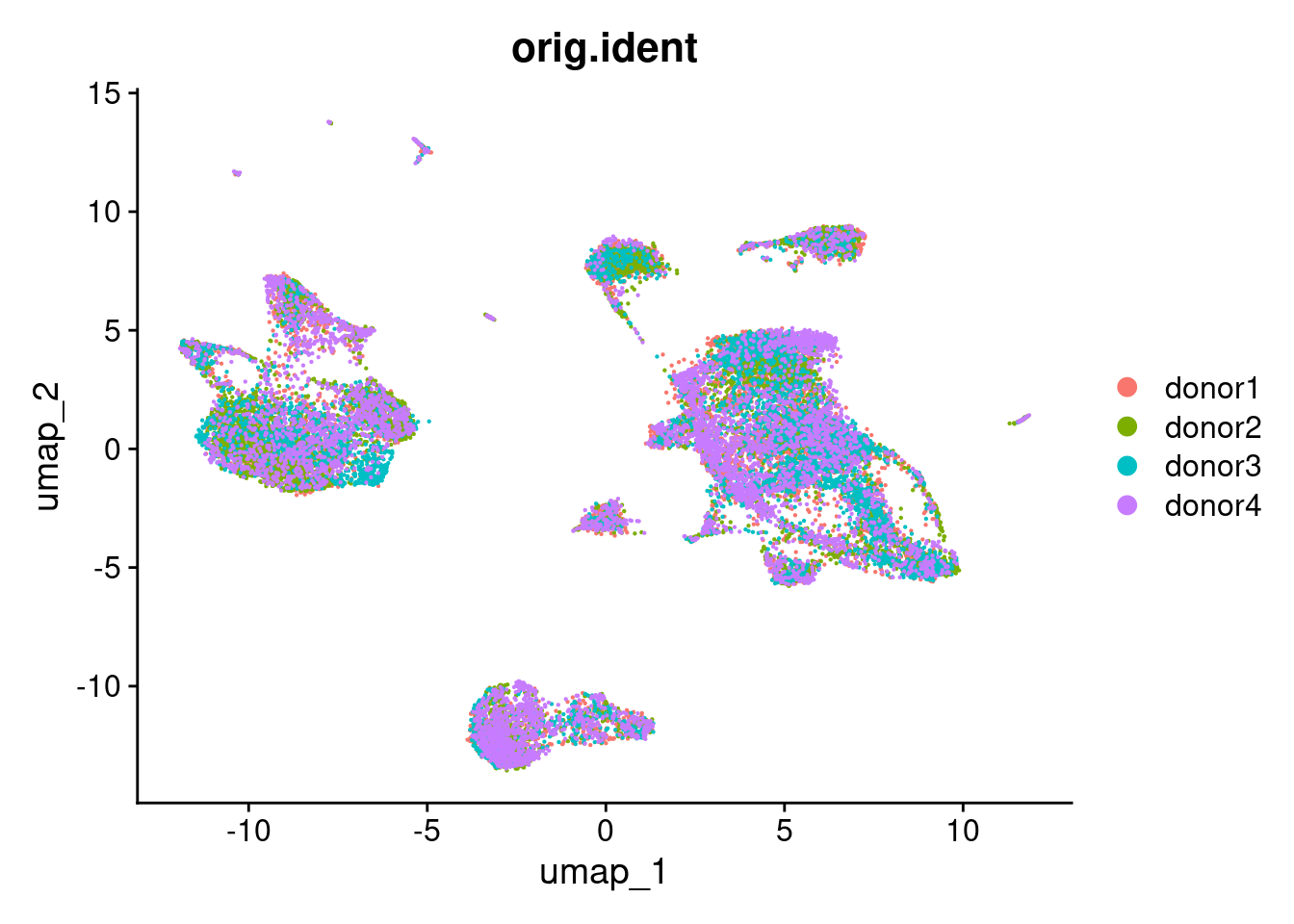 Col names: donor1_AAACCAAAGGTGACGA-1, donor1_AAACCCTGTGACGAGT-1 ... donor4_TGTGTTGAGTTACGGC-1