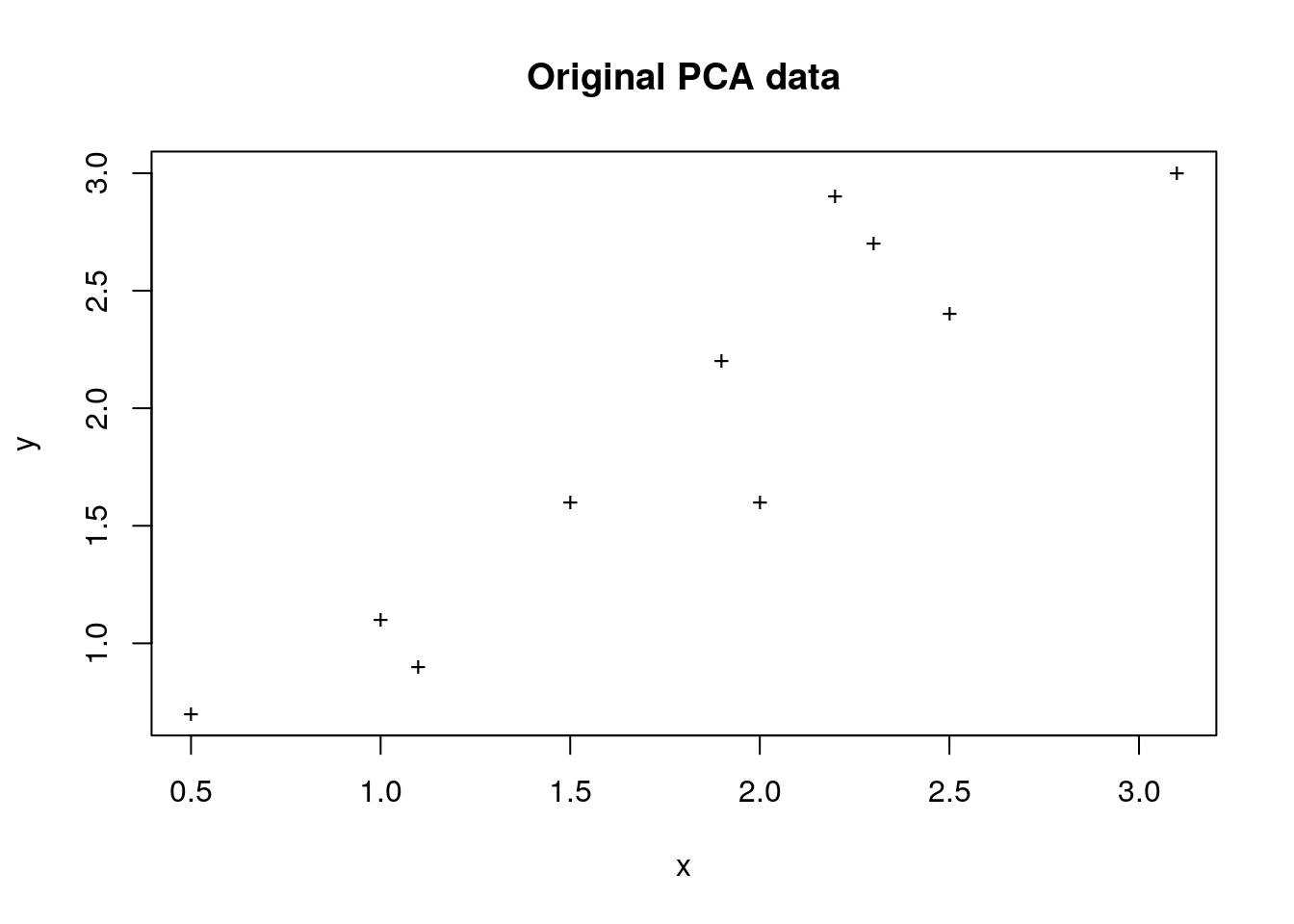 x = c(2.5, 0.5, 2.2, 1.9, 3.1, 2.3, 2, 1, 1.5, 1.1),