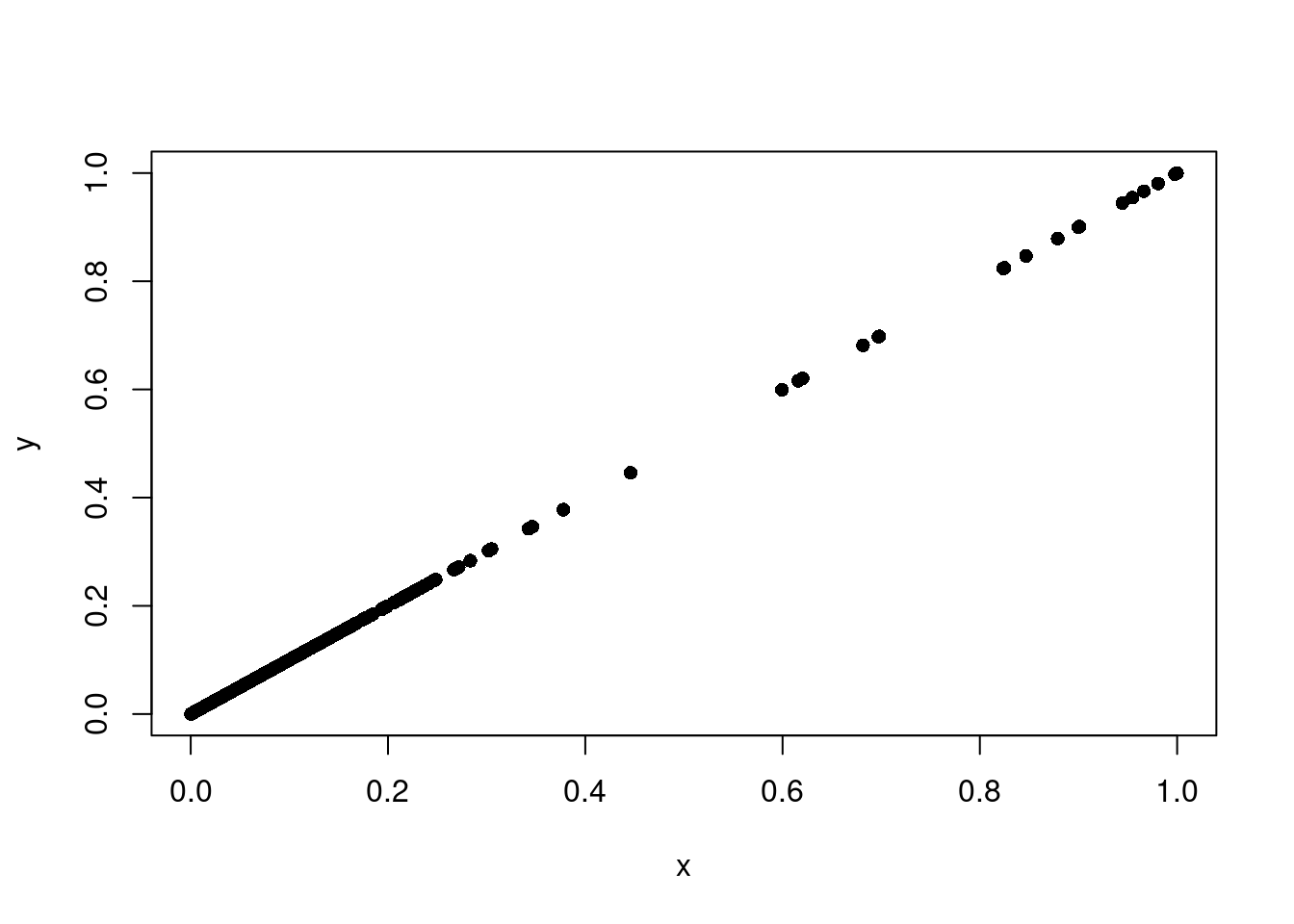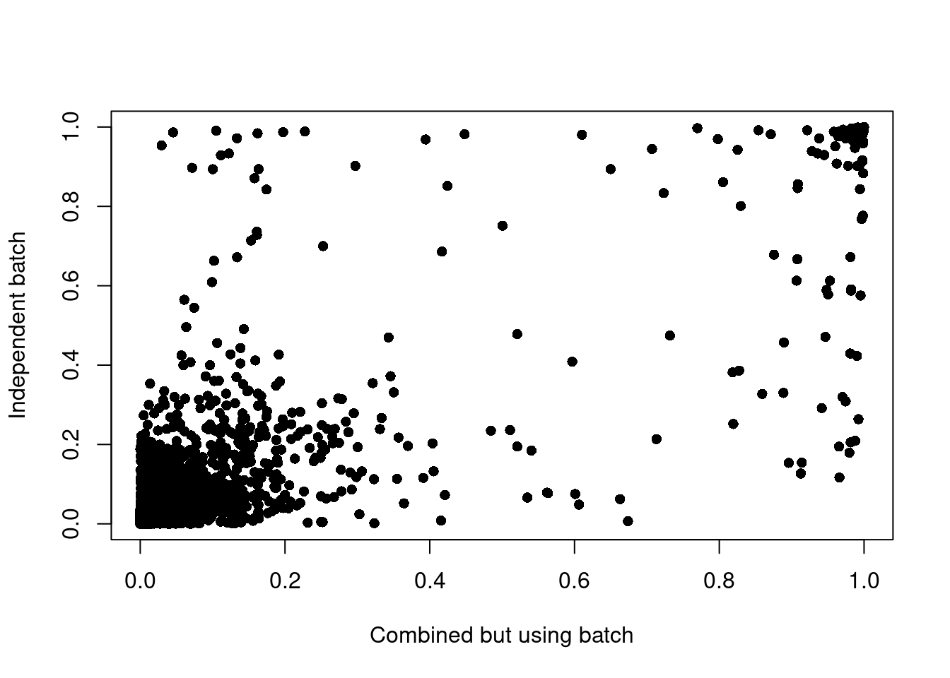 plot(x, y, pch = 16, xlab = "Combined but using batch", ylab = "Independent batch")