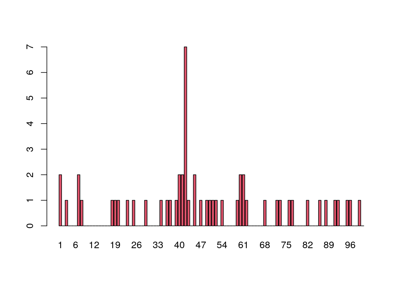 Below is data for 50 patients tallied at each of the 100 positions. If there are no allergic reactions, the false positive rate of 1% means that for a single patient, each individual position has a probability of 1 in 100 of being a 1. After tallying 50 patients, we expect at any given position the sum of the 50 observed 0/1 variables to have a Poisson distribution with paramater 0.5 (50 * 1/100).