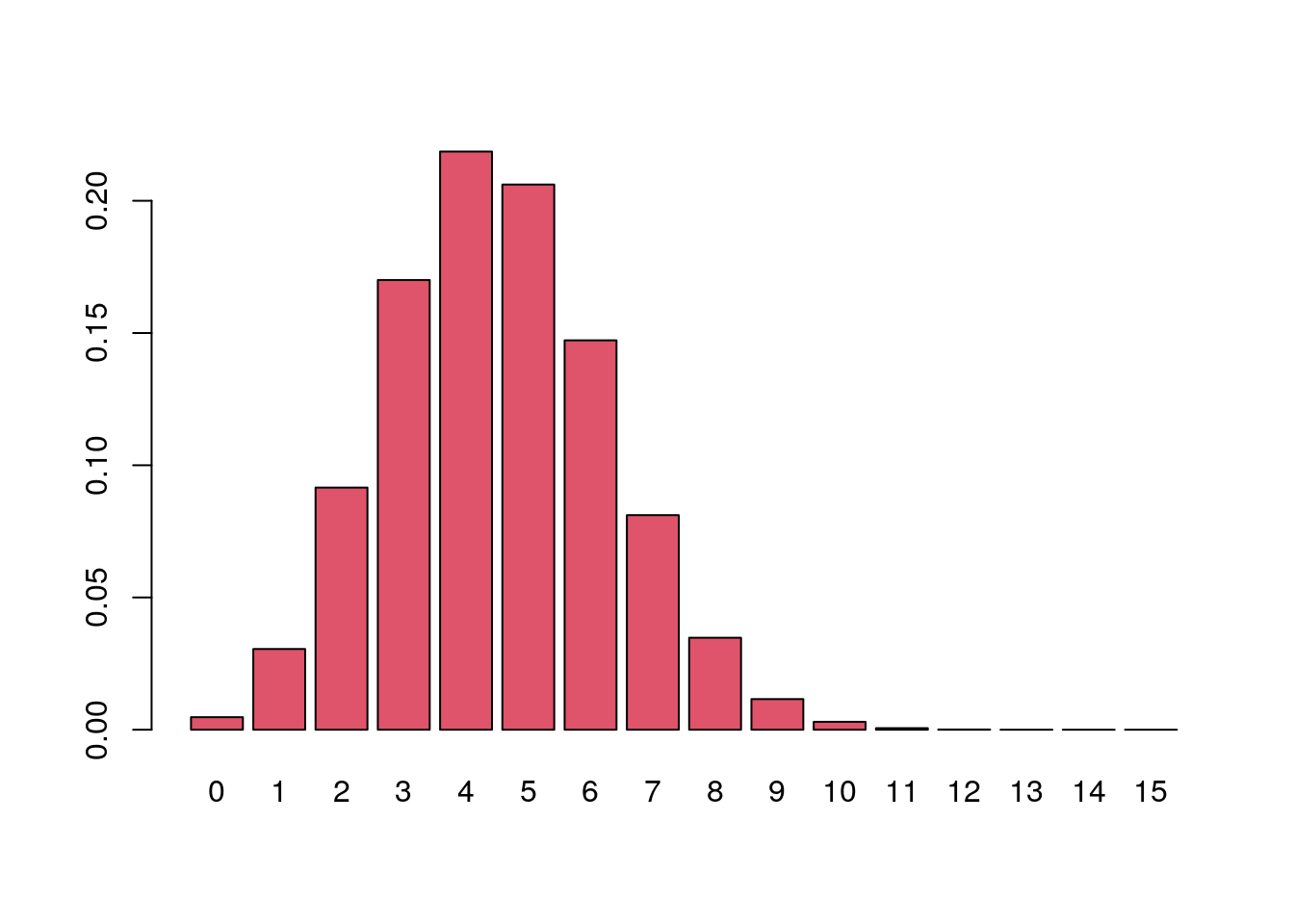 The number of successes in 15 Bernoulli trials with a probability of success of 0.3 is called a binomial random variable or a random variable that follows the \(B\)(15,0.3) distribution. If we replicate trial 100 times, we will see that the most frequent value is 4.