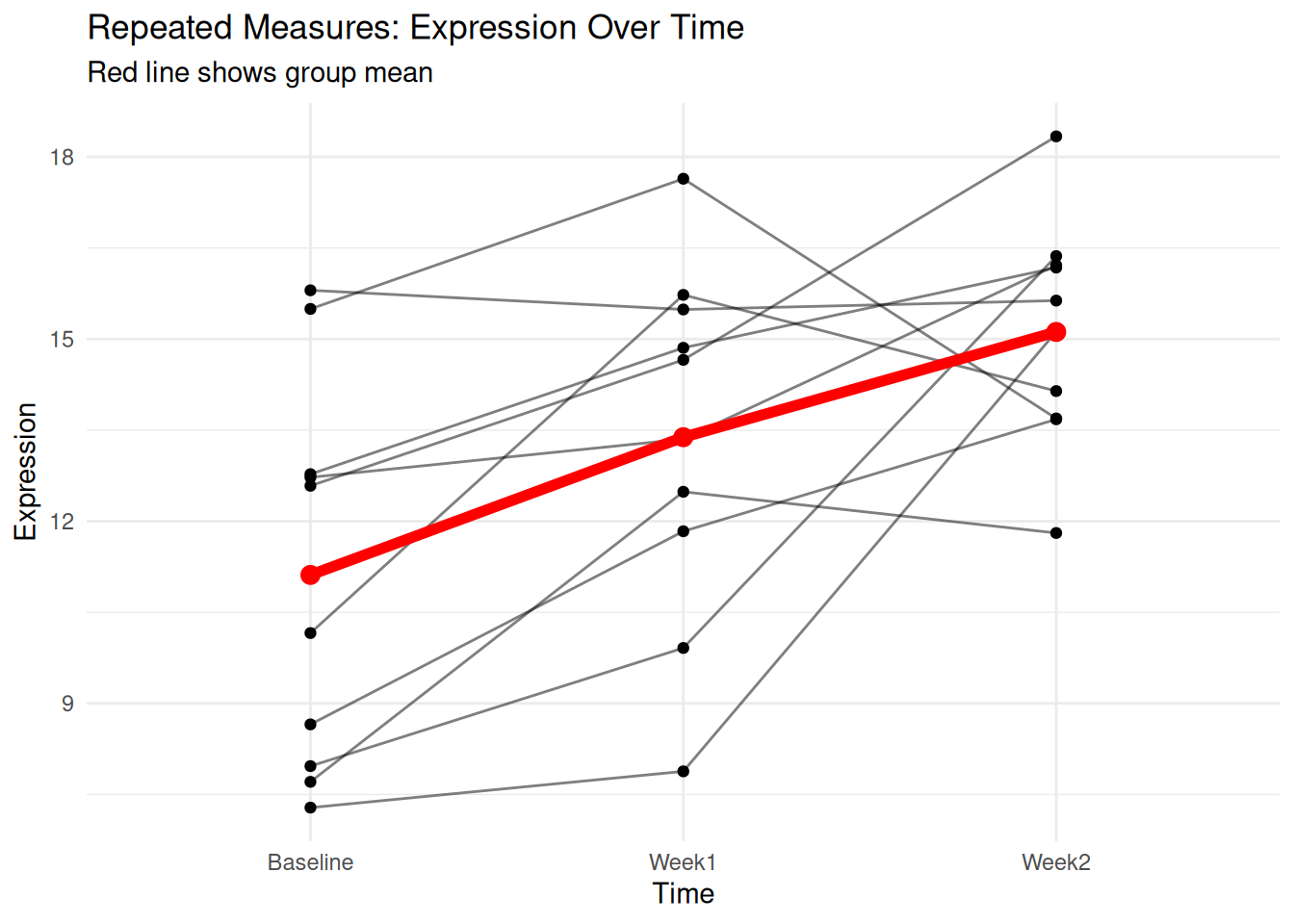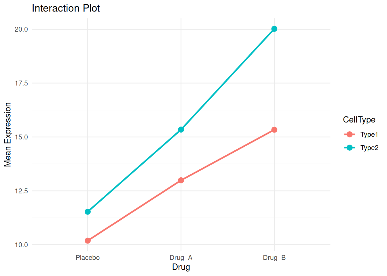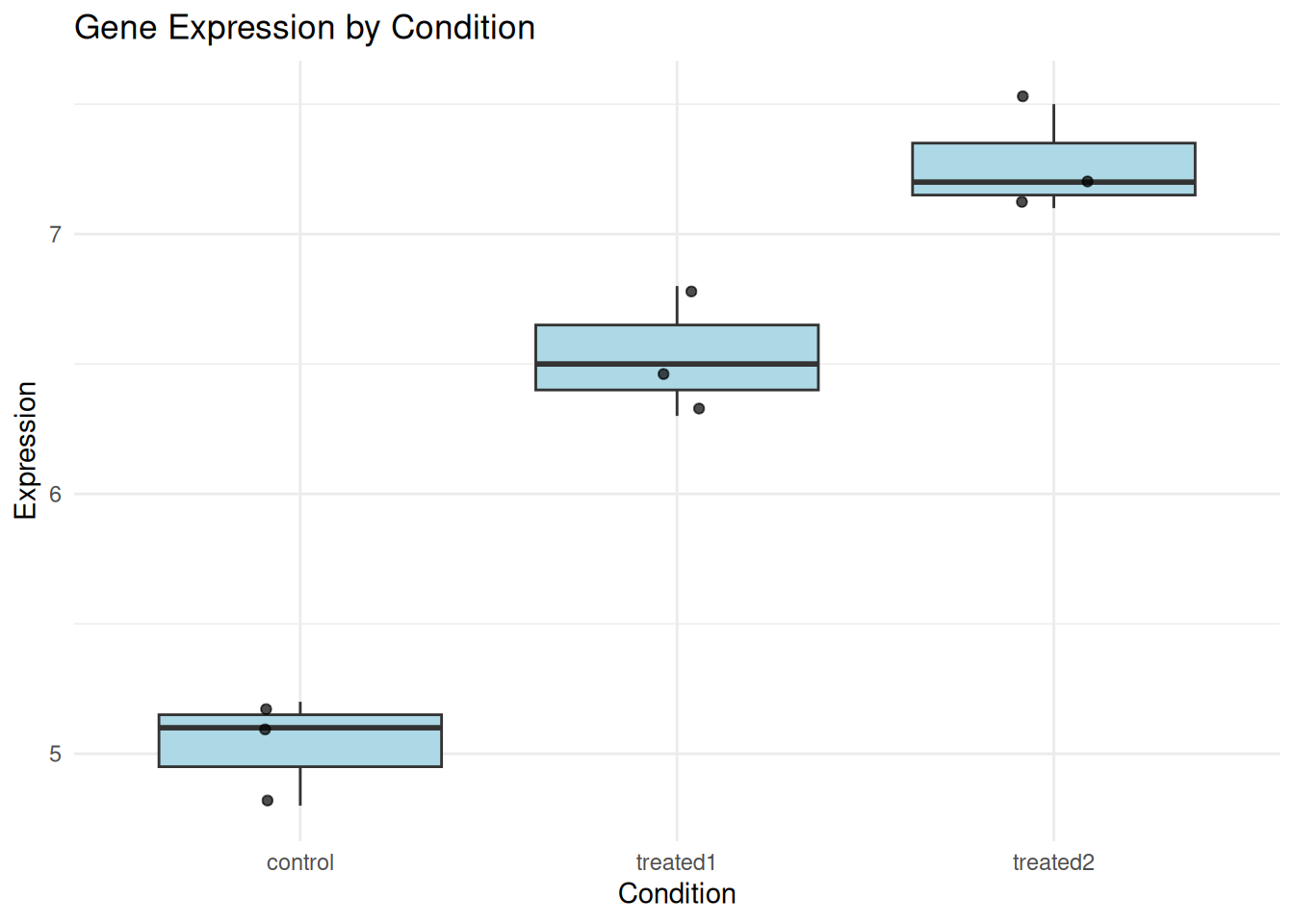 Example: “A one-way ANOVA revealed a statistically significant difference in gene expression between conditions, F(2, 6) = 50.17, p = 0.002, \(\eta^2\) = 0.94. Post-hoc Tukey HSD tests showed that treated2 had significantly higher expression than control (p = 0.002) and treated1 (p = 0.047).”