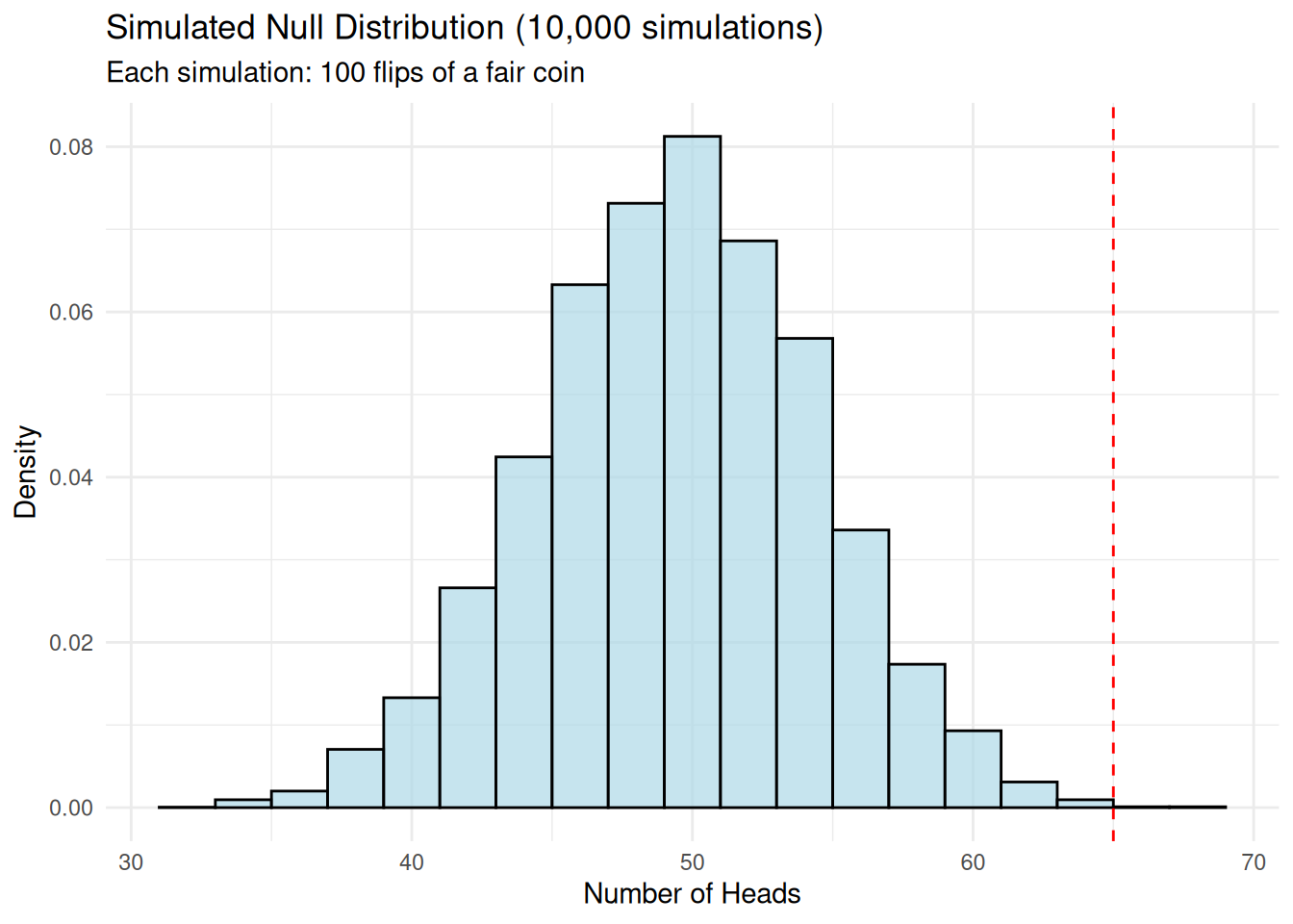 Suppose we flip a coin 100 times and observe 65 heads. Is this coin fair (\(p = 0.5\)) or biased?