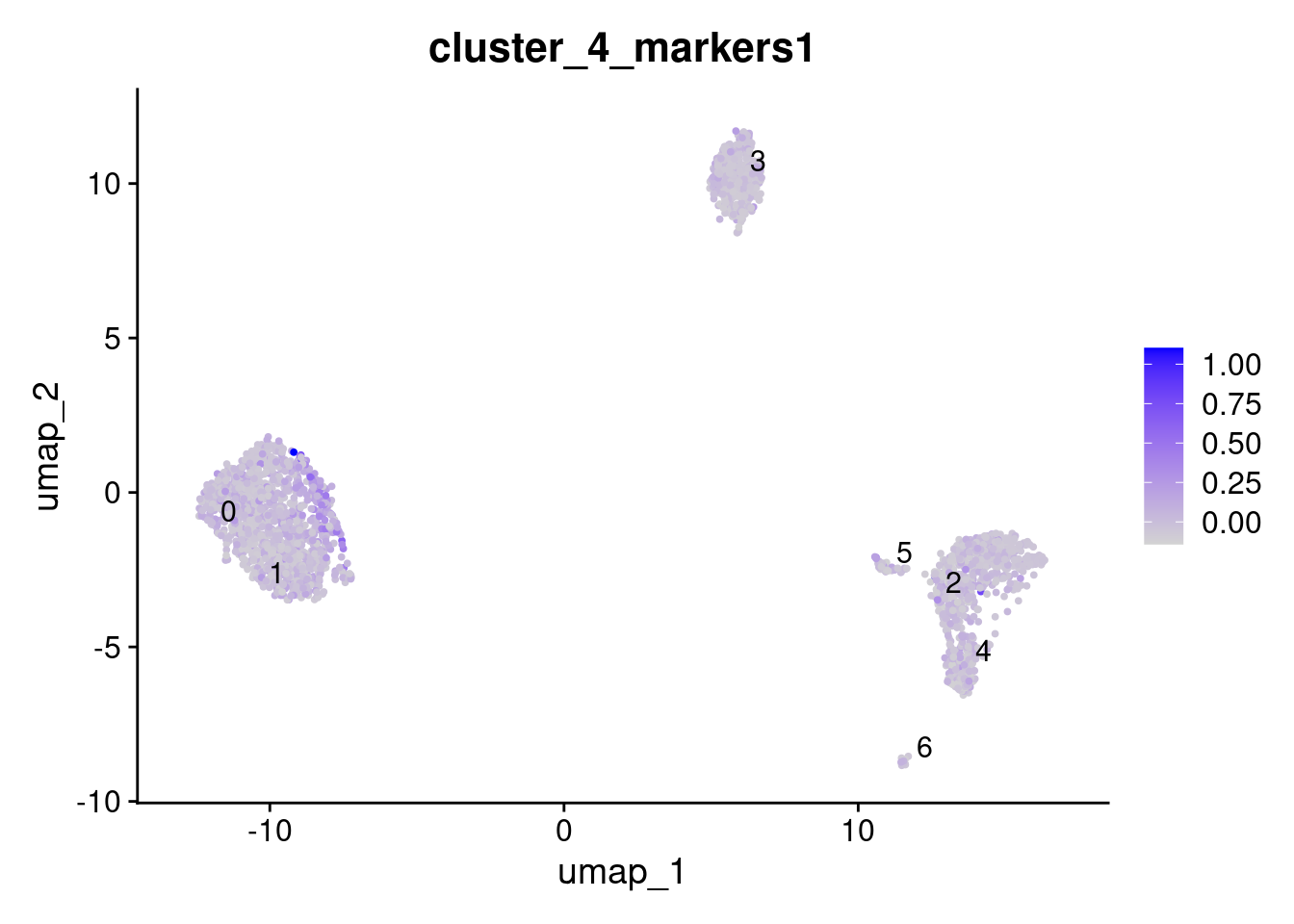 FeaturePlot(object, features = "cluster_4_markers1", label = TRUE)