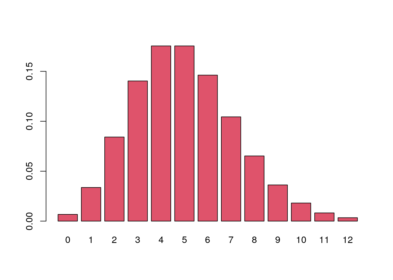 Success and failure can have unequal probabilities in a Bernoulli trial, as long as the probabilities sum to one, i.e., complementary events. To simulate 12 trials with unequal probabilities, we just use a different prob. The 1’s indicate success and 0’s failure.