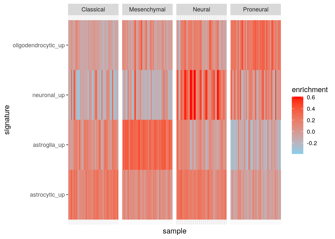 gbm_ssgsea <- gsva(ssgseaParam(gbm_eset, brainTxDbSets), verbose=FALSE)