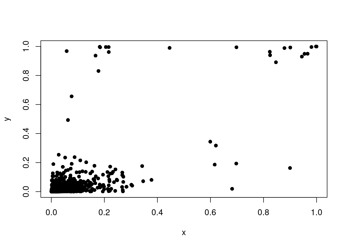 plot(x, y, pch = 16, xlab = "Combined but using batch", ylab = "Independent batch")