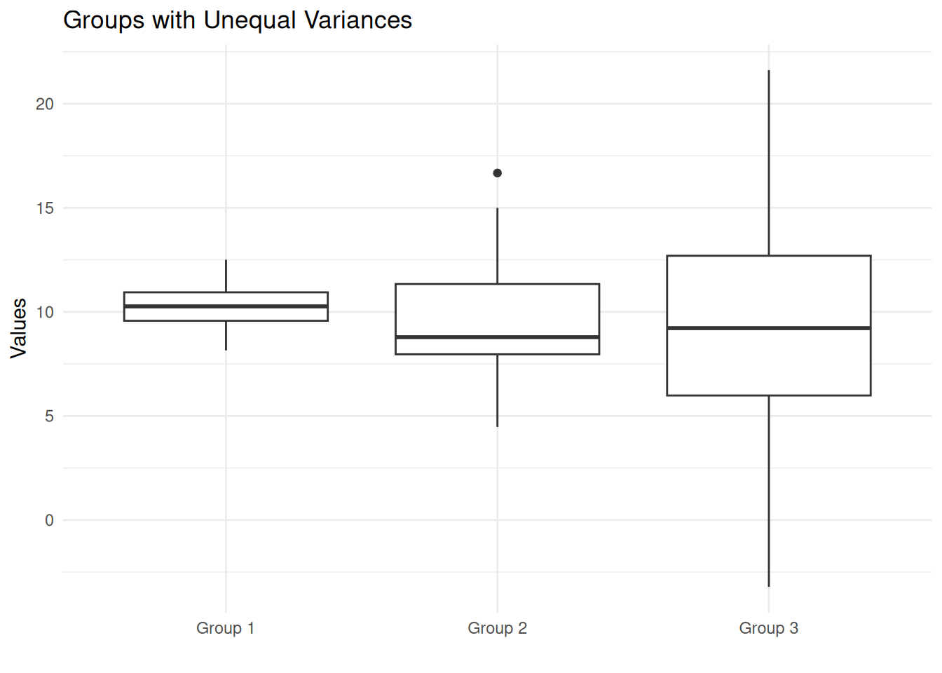 Notice how Group 1 has a narrow spread while Group 3 has a much wider spread, despite all three groups having similar centers (means around 10).