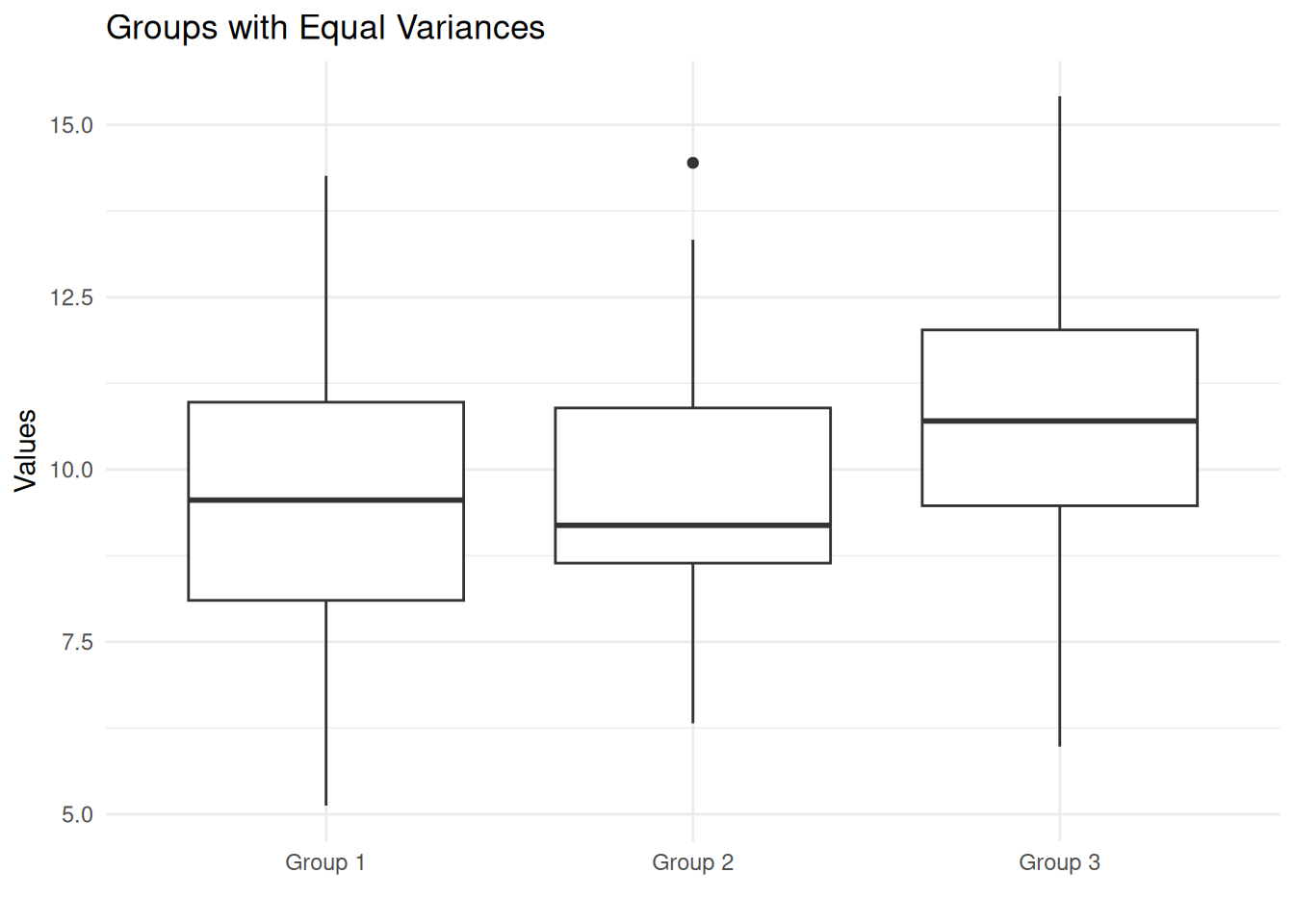 labs(x = '', y = 'Values', title = 'Groups with Equal Variances')