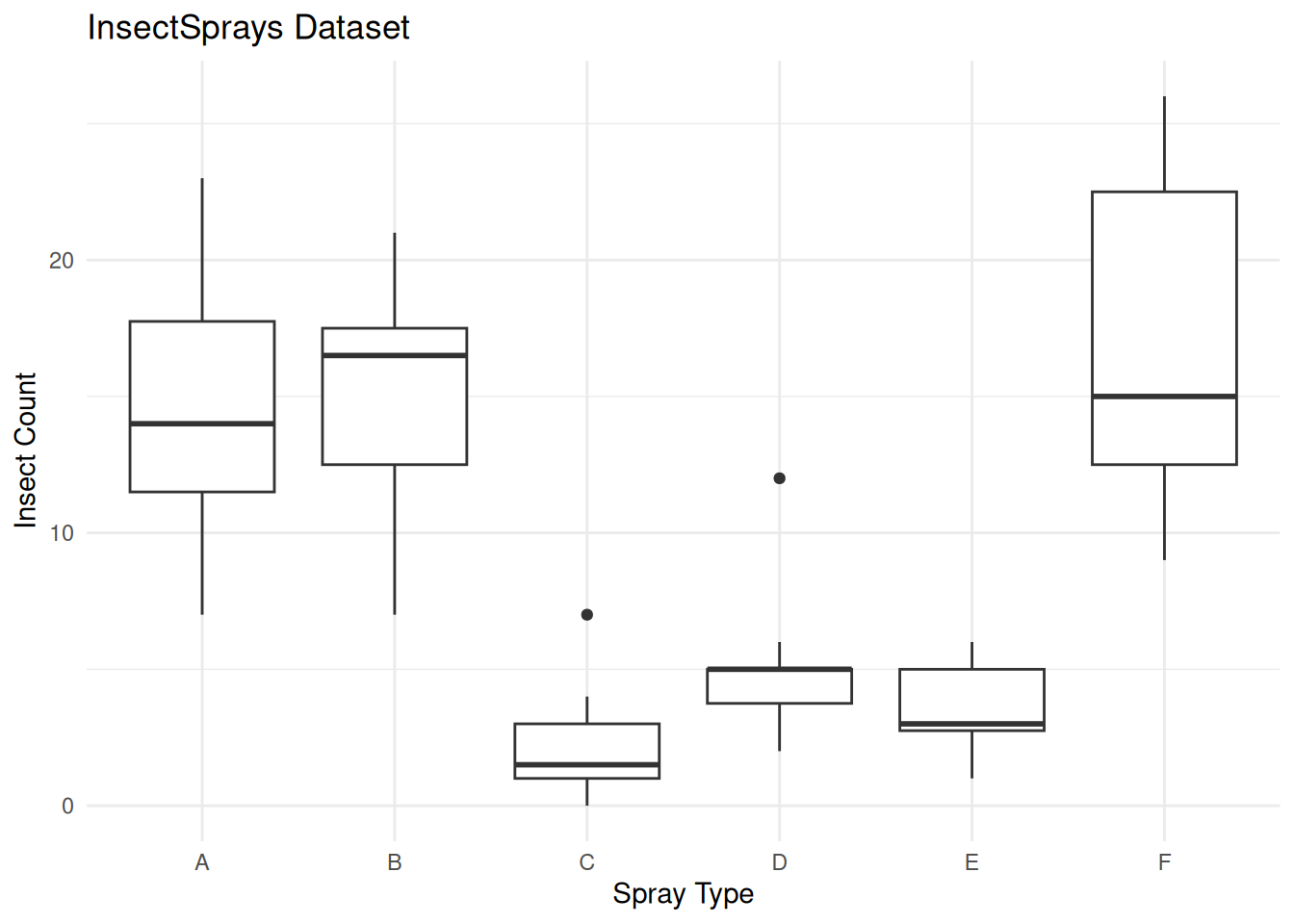 labs(x = 'Spray Type', y = 'Insect Count', title = 'InsectSprays Dataset')