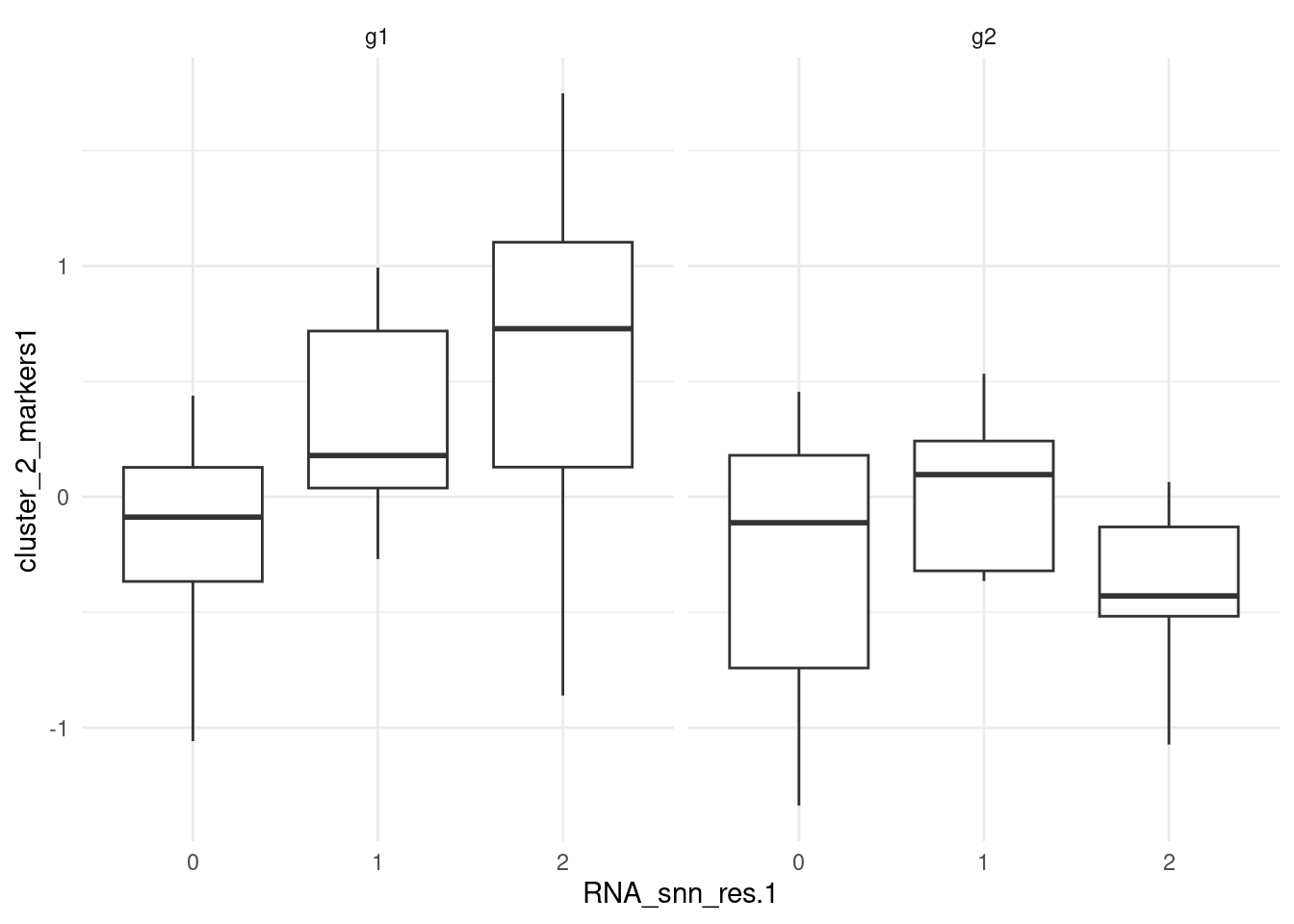 ggplot(pbmc_small@meta.data, aes(RNA_snn_res.1, cluster_2_markers1)) +