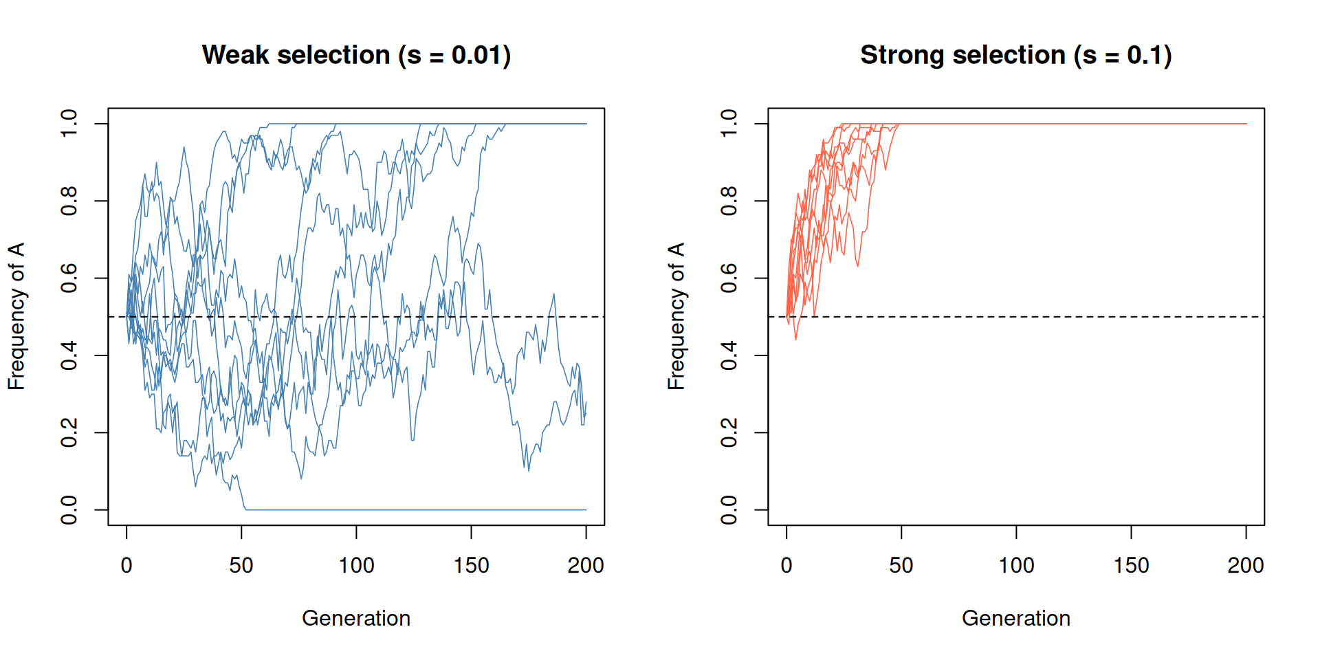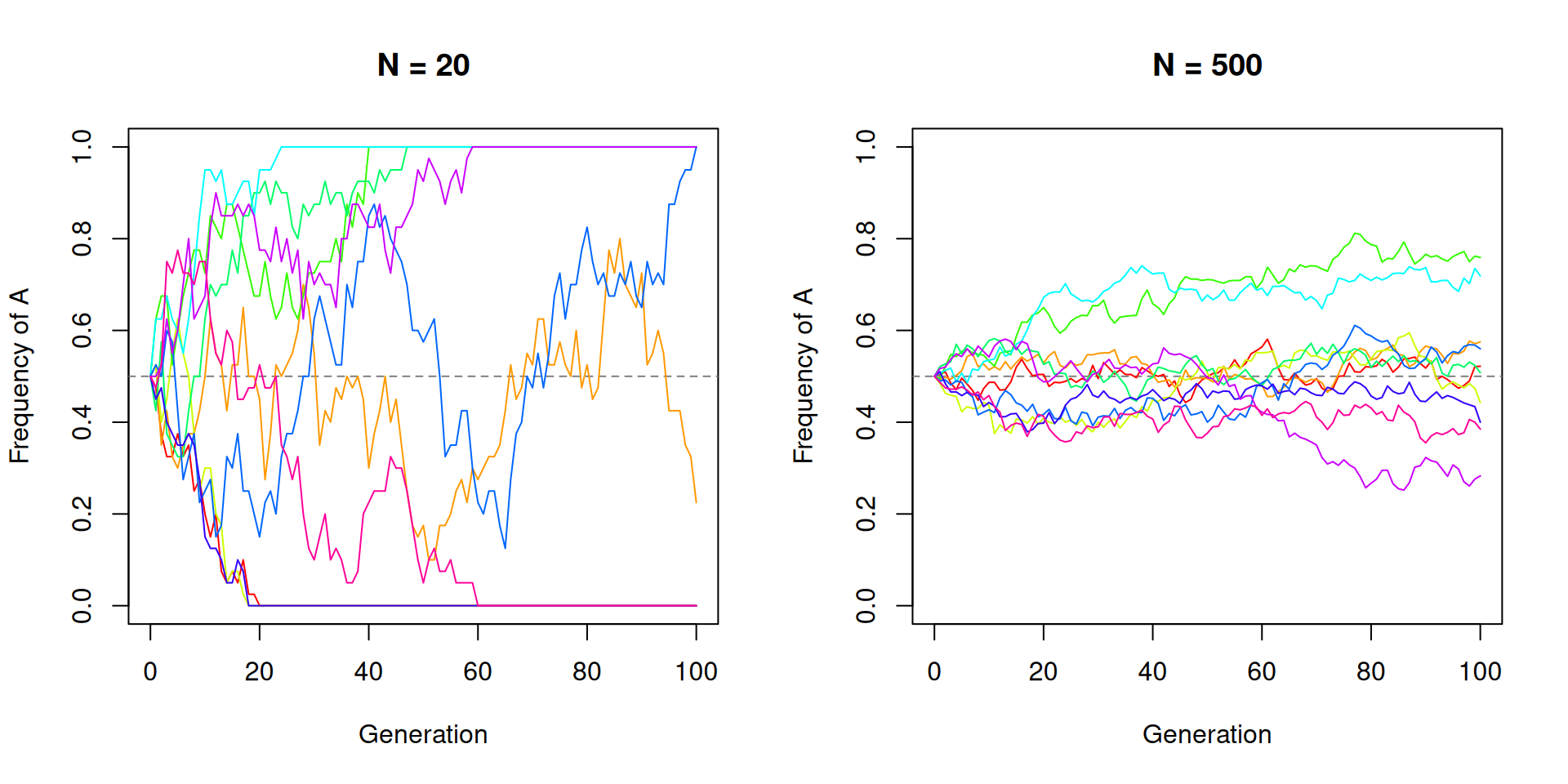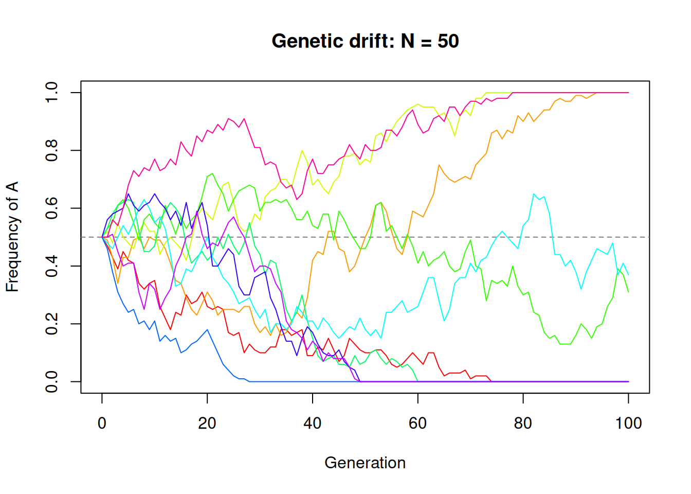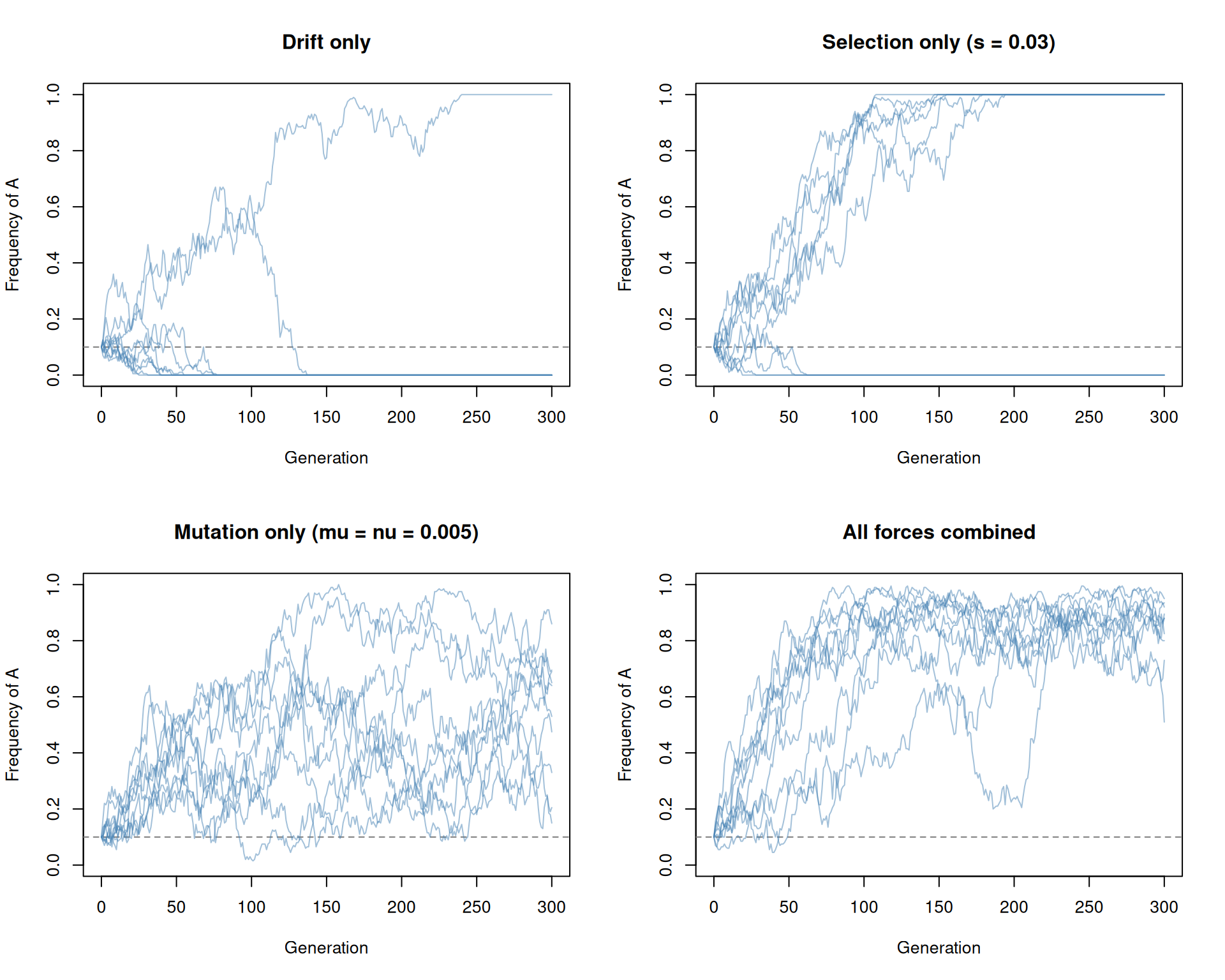 Here, we will simulate evolution using only base R. We will start with drift alone, then layer on selection and mutation to see how each force shapes allele frequency trajectories.