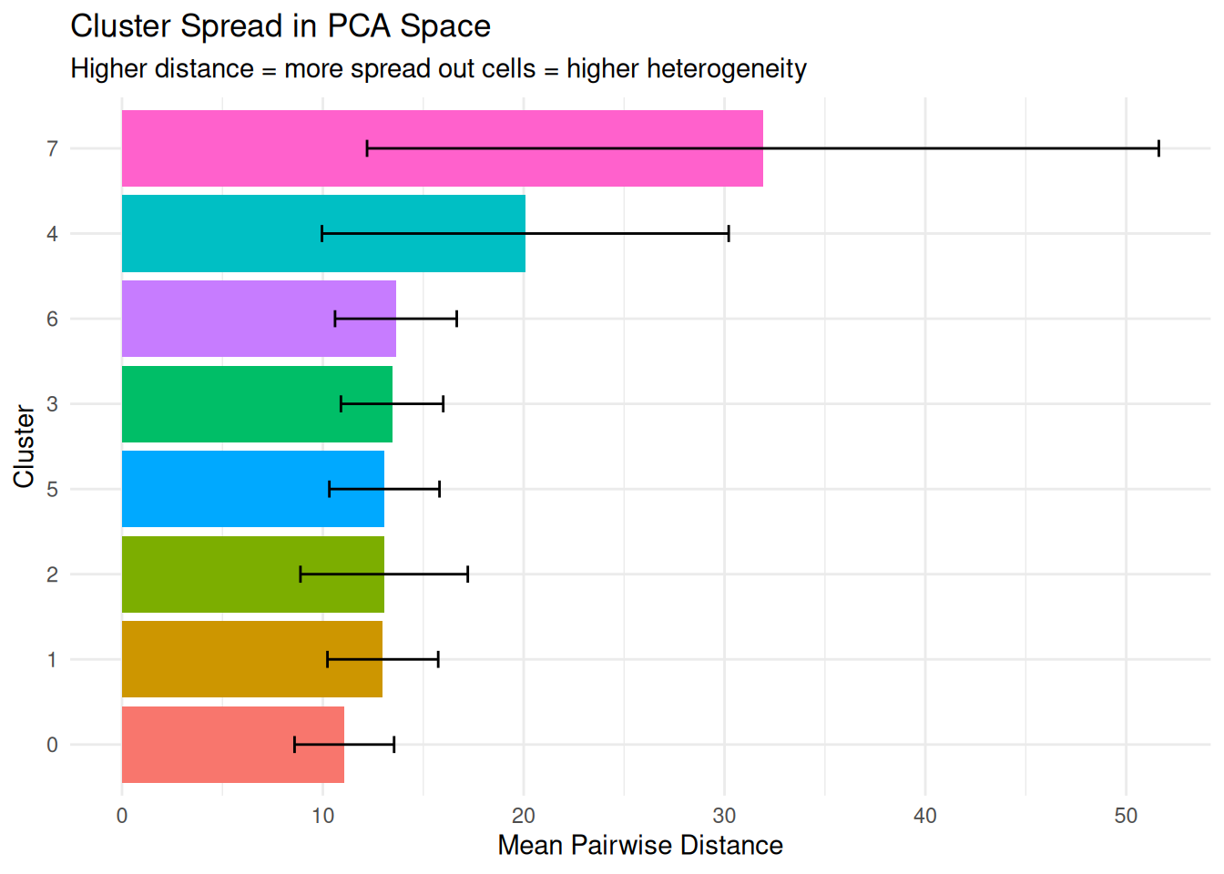Access the heterogeneity in scRNA-seq clusters where heterogeneity refers to how variable or diverse cells are within a given cluster. High heterogeneity means cells in that cluster are quite different from each other, while low heterogeneity means they’re very similar.