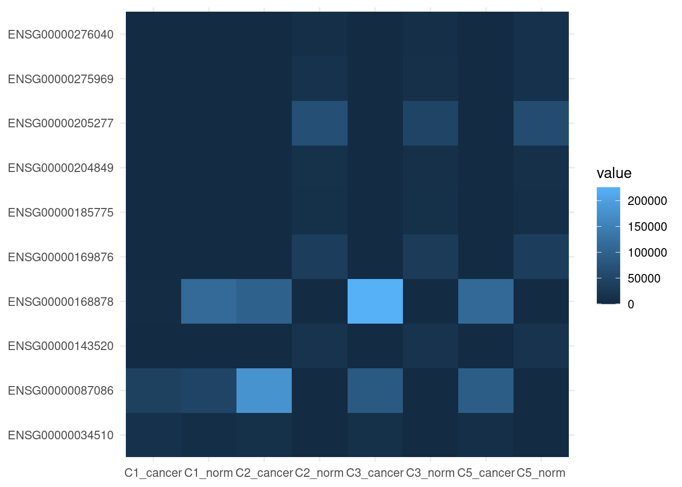 ggplot(aes(name, ensembl_gene_id, fill = value)) +