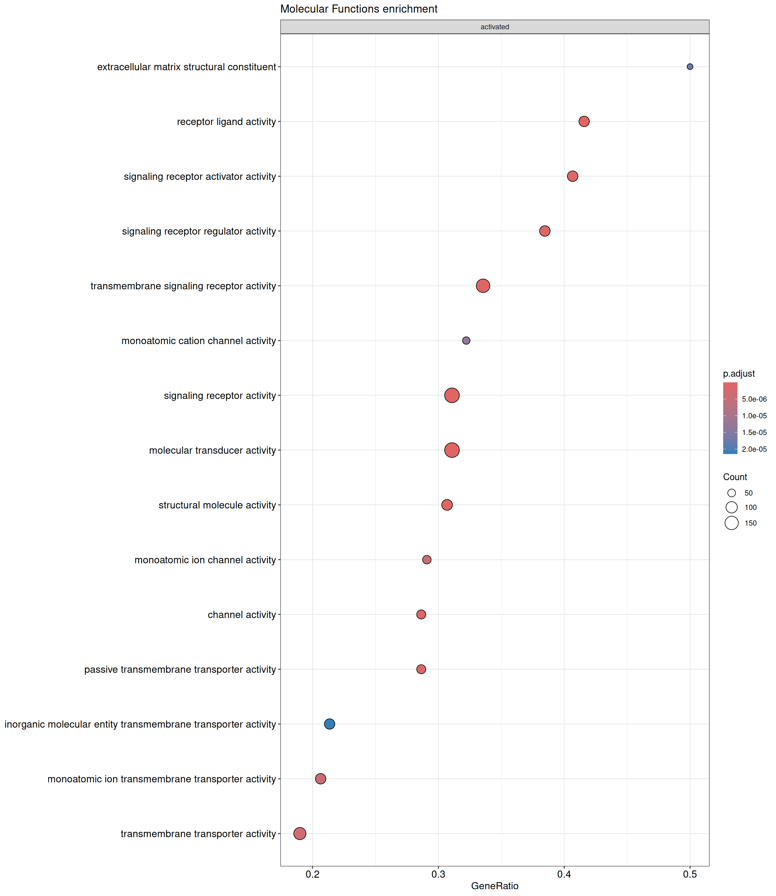 GSEA is performed separately on each subontology: biological processes (BP), cellular components (CC) and molecular functions (MF). The dot plot below shows all the enriched GO terms. The size of each dot correlates with the count of differentially expressed genes associated with each GO term. Furthermore, the color of each dot reflects the significance of the enrichment of the respective GO term, highlighting its relative importance.