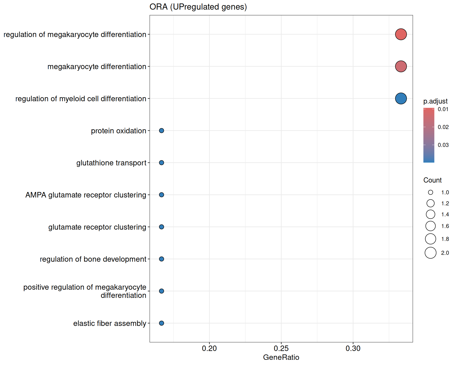 We performed a functional enrichment analysis based on Over-Representation Analysis (ORA) using the GO pathway database. Unlike GSEA, which considers the entire ranked list of genes, ORA focuses only on genes that meet specific differential expression thresholds (adjusted p-value and log2 fold change). The analysis was conducted separately for upregulated and downregulated genes to identify GO pathways that are significantly enriched in each group, compared to what would be expected by chance. This allows for a clearer biological interpretation of distinct transcriptional programs activated or suppressed in the dataset. The dot plots below display all significantly enriched GO pathways. Each dot’s size represents the number of differentially expressed genes associated with the pathway, while the color reflects the statistical significance of the enrichment (adjusted p-value).